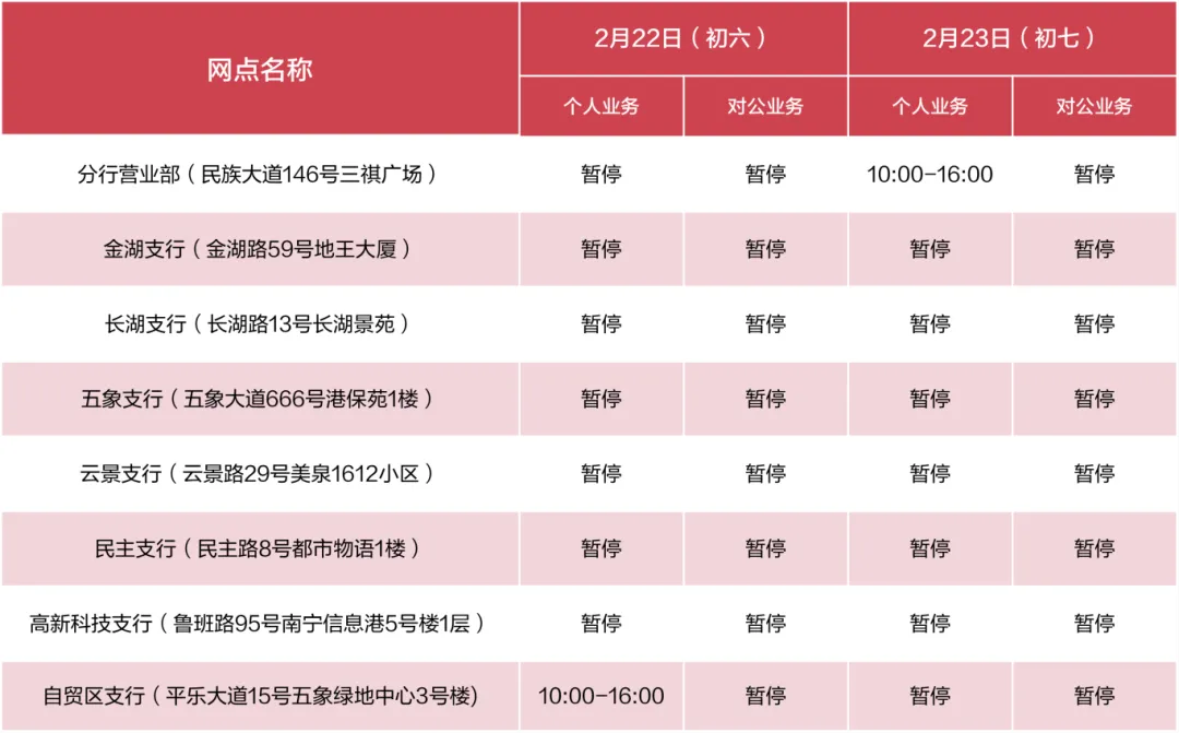 广发银行南宁分行2026年“春节”假期期间网点营业时间安排如下: