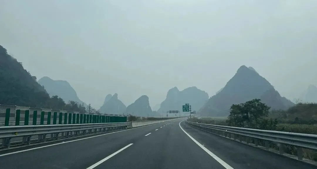 那87公里上,此言不虚。车窗外,是无边无际的甘蔗林,像一片绿色的海;远处,一座座喀斯特山峰拔地而起,在阴沉雨雾的笼罩下,俨然一幅巨幅的水墨山水长卷,在我们的前挡风玻璃上缓缓铺展。一边开车,一边忍不住在心里“哗~”地惊叹。