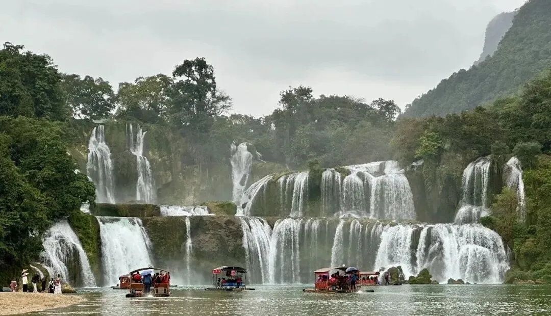 景区规划清晰,沿栈道前行即可。步行约十分钟,便是竹筏码头。秉承“来都来了”的旅行最高哲学,48元/人,换得与瀑布贴身接触的机会。竹筏破水而行,水汽扑面。不时有越南小贩驾船靠近兜售香烟(导游提前打过招呼:无保障,勿购买)。越近瀑布,水声愈大,飞沫如雨,头发愈显湿滑。与贵州黄果树瀑布的磅礴遥观不同,德天瀑布允许你闯入它的水雾之中,感受那份平易近人又充满野性的能量。偶尔,载着越南游客的竹筏从旁划过,他们的欢声笑语,与我们的专注拍照打开,倒也相映成趣。