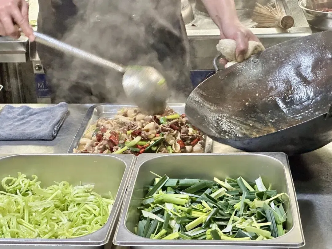藏身于小区之中。流程充满市井智慧:一人排队夹取琳琅满目的新鲜猪牛肉&内脏(此时队友务必火速抢占空桌),另一人则接着排队结账、选定辣度。我们点的微辣,外加一份清甜油麦菜。坐在厨房边,看着猛火蹿升,闻着香气爆裂,肚子早已叽咕乱叫。目睹一位勇士点了“爆辣”,那出锅时堆成小山的辣椒,光是看着,屁股就已隐隐感到灼热。