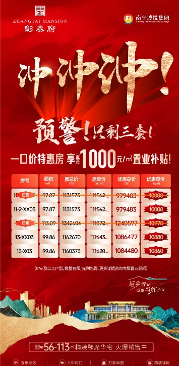最关键的是,春节专属福利来袭,彰泰府推出特别优惠:一口价特惠房仅剩3套!同时提供至高1000元/㎡的置业补贴、到访抽奖赢至高40万元大奖、购房砸金蛋赢品牌家电等。
