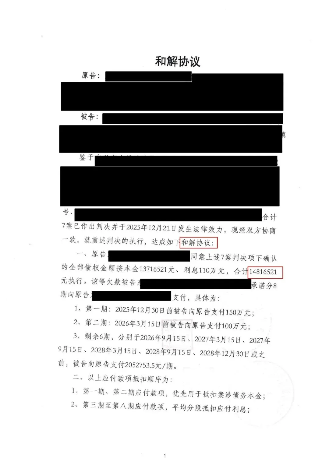 执行和解协议不仅确认了逾千万元的债权金额,更在付款顺序、费用承担、违约责任等关键条款上为原告设置了多重保障: