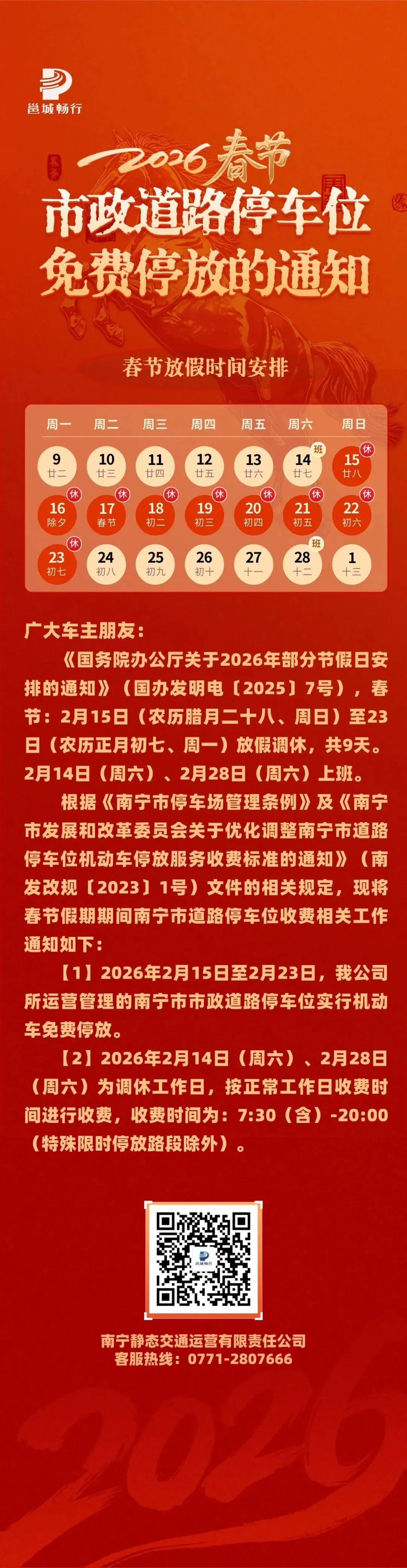 2月11日,“邕城畅行”微信公众号发布《2026年春节 | 南宁市政道路停车位免费停放的通知》,具体内容如下👇