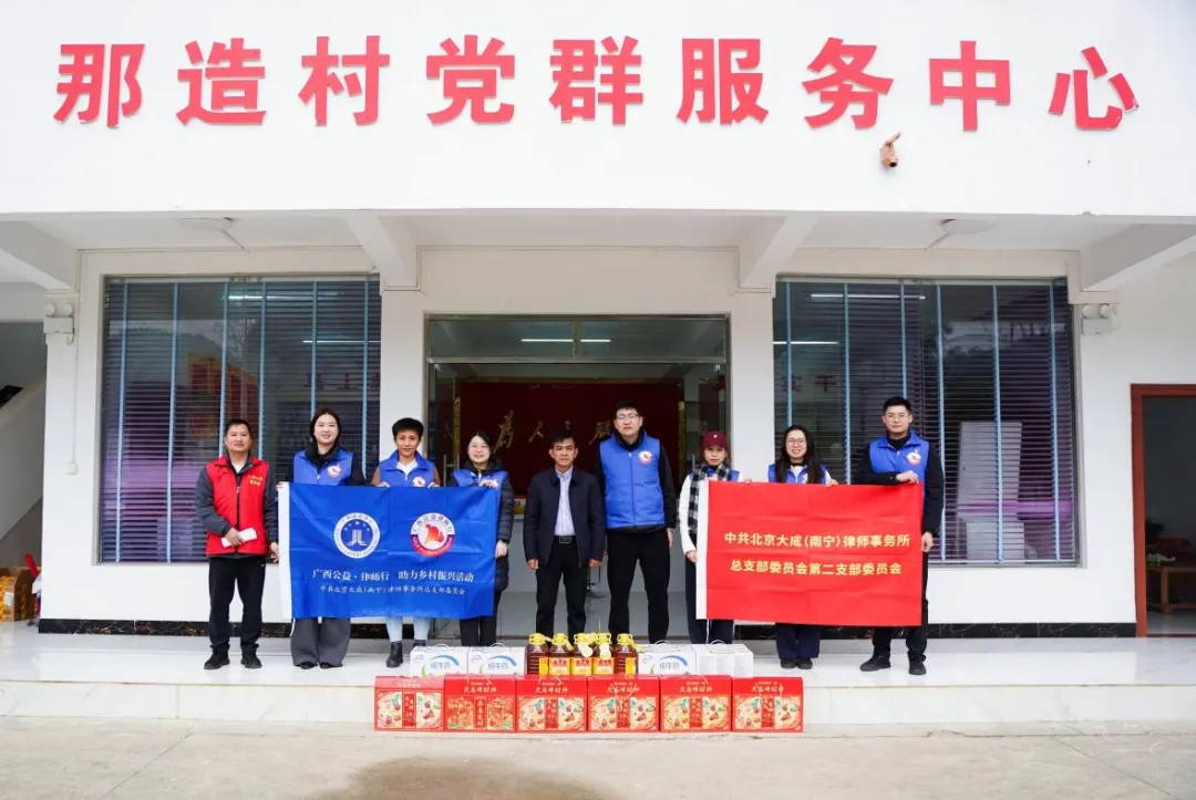 新春佳节将至,关怀温暖先行。2026年2月10日,大成南宁党总支第二党支部书记陈昌松、副书记曹章莹带领6名党员同志赴百色市德保县城关镇那造村开展公益法律服务、春节走访慰问调研活动。此次活动旨在推动《律师事务所党组织与乡村振兴帮扶村党组织结对共建协议》落实落地,以实际行动助力乡村振兴。