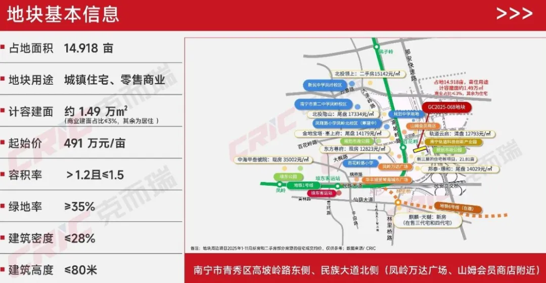 2025年12月的时候,凤岭北高坡岭路出让了一宗GC2025-068地块,该地块仅约19亩,楼面价4910元/㎡。隔壁的邦泰在南宁地价最低谷的2024年3月拿的地,当时的楼面价都要5538元/㎡。