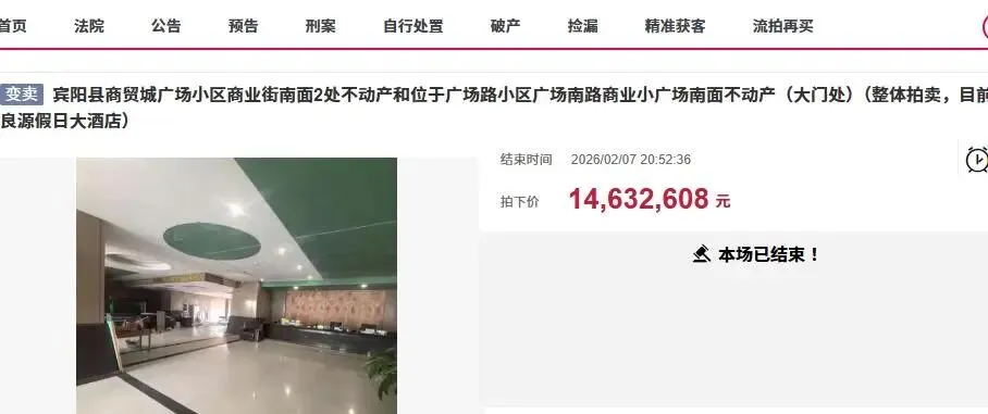 近日,在阿里拍卖上,南宁市宾阳县迎来了一宗重量级的房产拍卖,位于宾阳县商贸城广场小区商业街南面2处不动产和位于广场路小区广场南路商业小广场南面不动产(大门处)被整体拍卖,起拍价1463.2608万元,评估价1829万元。最终拍卖只有一个人报名竞拍,以起拍价拿下了这宗不动产。从拍卖结果来看,竞得者是宾阳县一家科技公司