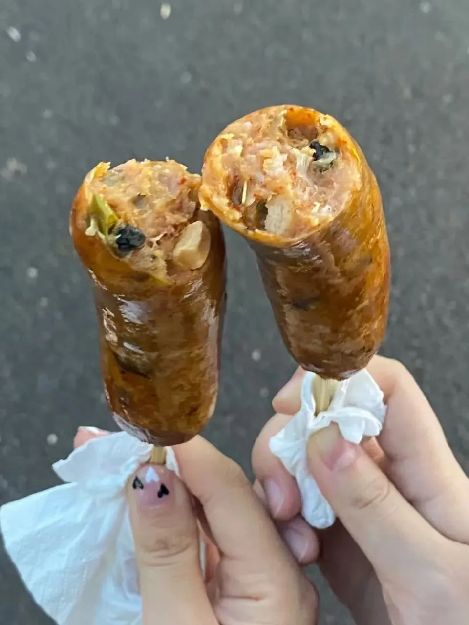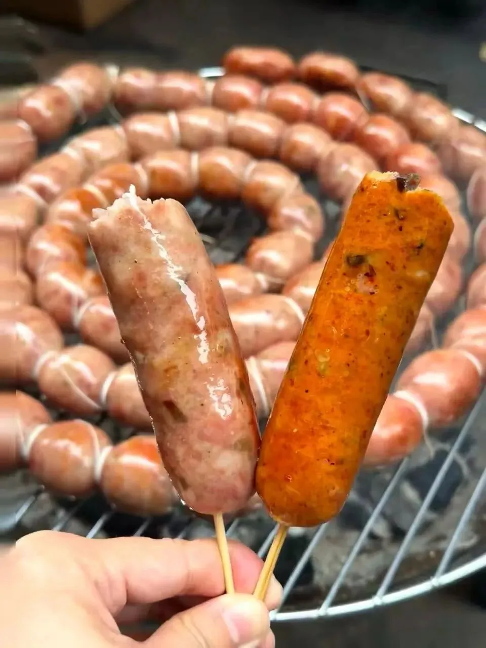 螺蛳粉味的香肠真的是绝绝子 ,它里面结合了螺蛳粉的酸辣鲜臭,常德外皮烤的焦香酥脆的 ,肉馅里能吃到螺蛳肉的Q弹扣力感 ,一口下去真的很满足,简直是螺蛳粉爱好者的天花板,重点是他还有好多不同的口味,有螺蛳粉味、老友味、三黄皮味、香芋味等。