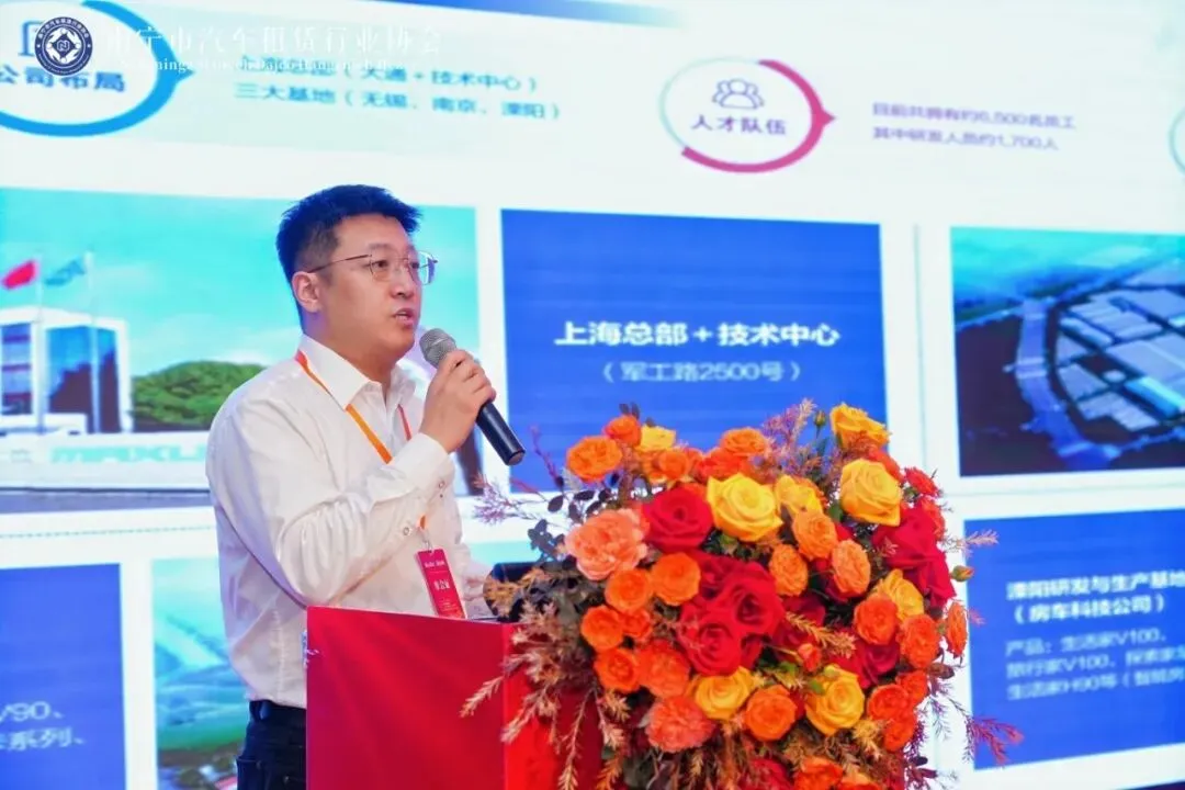 上汽大通出行业务负责人梁超展示全系产品矩阵,涵盖MPV、SUV、轻客、皮卡等细分市场,强调公司成立初期即布局海内外双线战略,产品兼顾国际市场需求及技术标准,全面参与国际市场竞争。