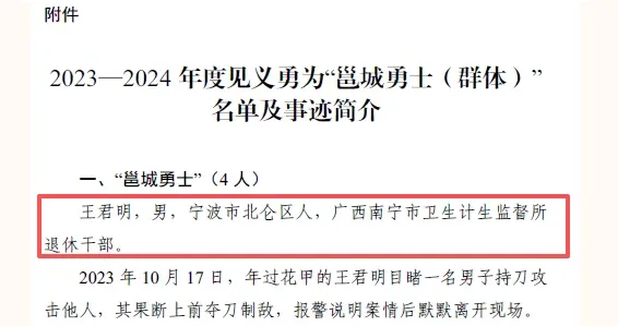 特别值得一提的是,退休干部王君明同志被授予“2023—2024年度南宁市见义勇为‘邕城勇士’” 荣誉称号,展现了疾控人的高尚品德与社会担当。