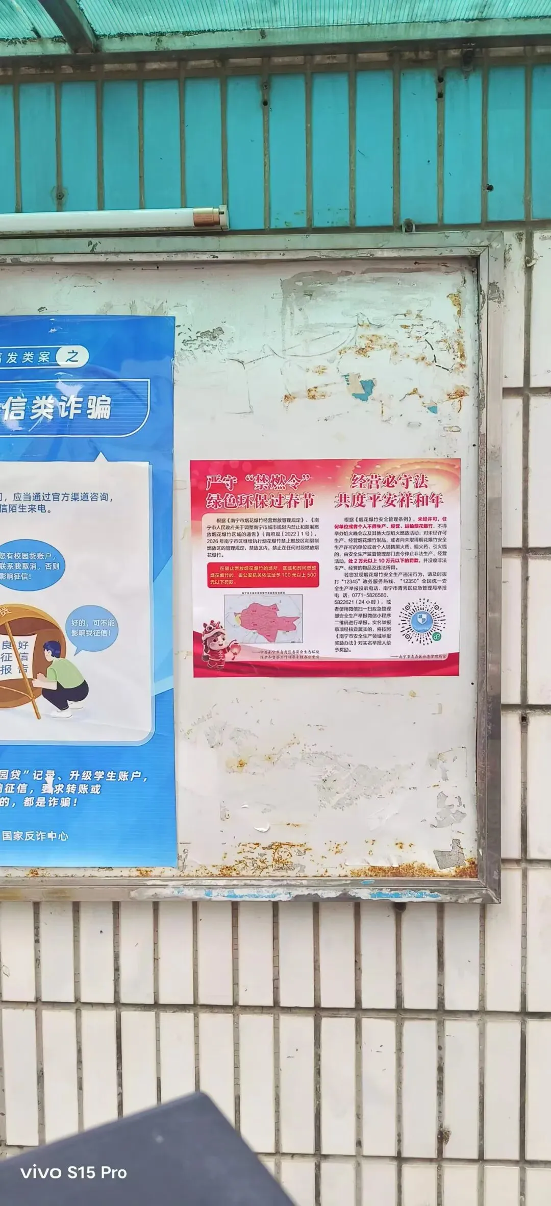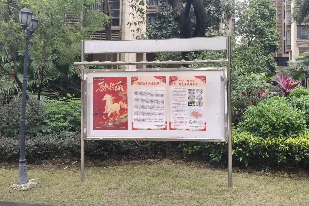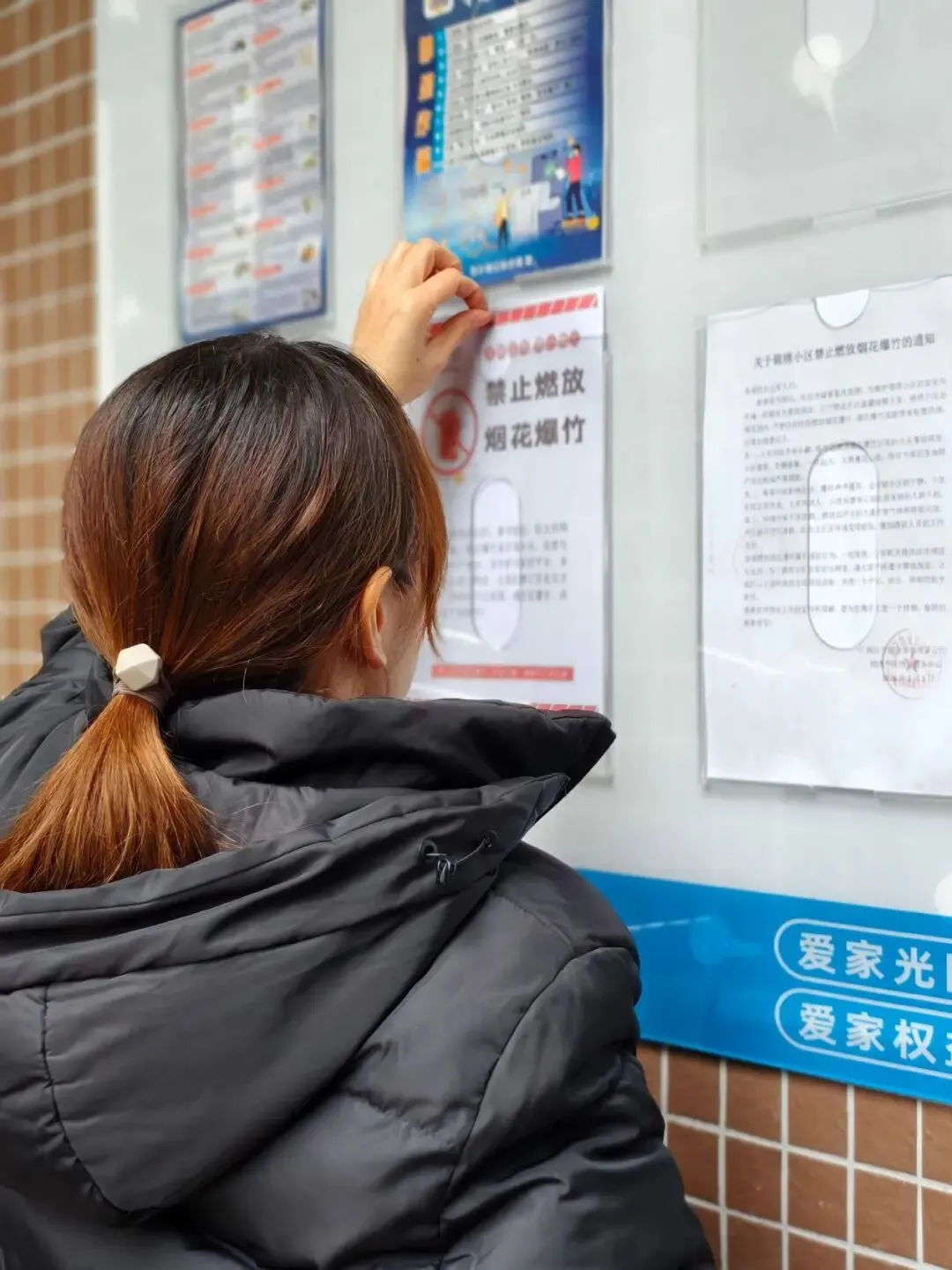 在小区公告栏张贴大幅禁燃烟花爆竹宣传海报,倡导安全文明、绿色环保过春节。