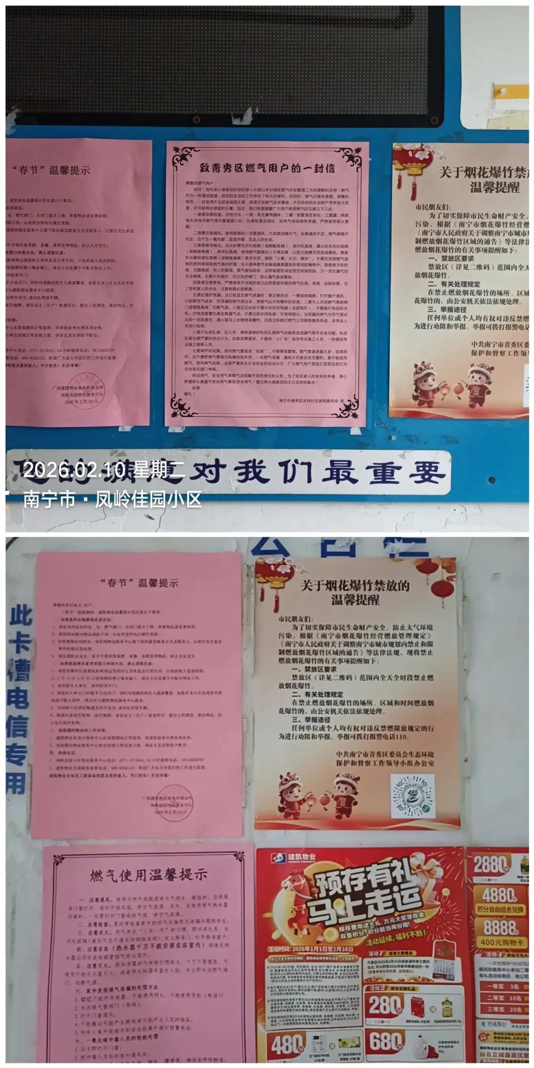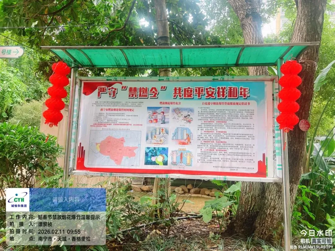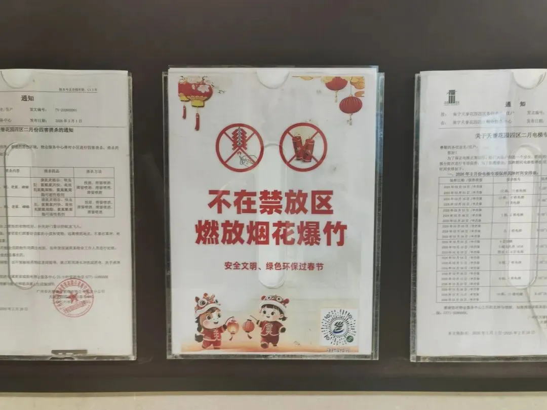 新春佳节将至,为严格落实烟花爆竹禁燃限放管控要求,切实保障人民群众生命财产安全和全市环境空气质量稳定达标,南宁物业行业积极开展宣传引导工作,提升广大业主的安全意识和法治观念,全力营造绿色文明、平安和谐的节日氛围。