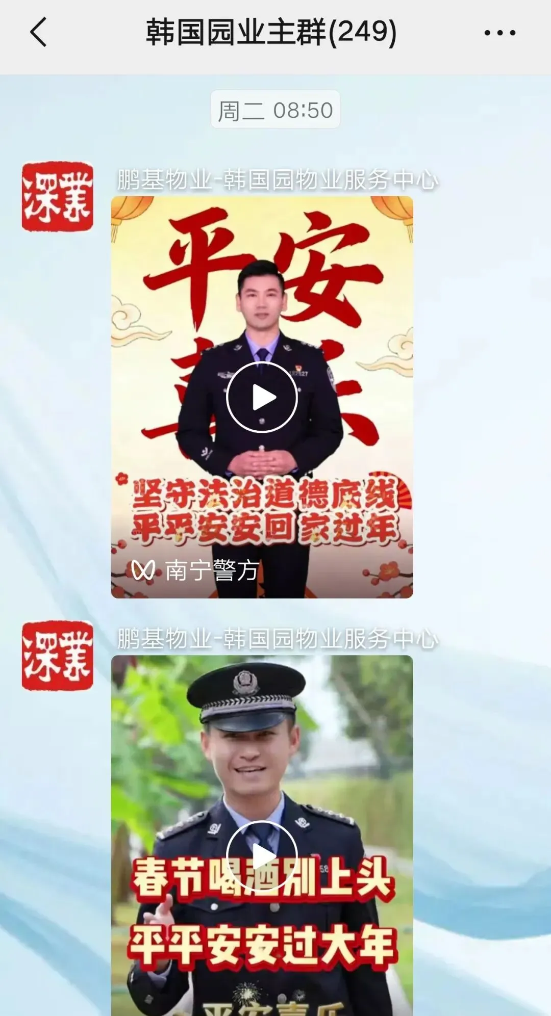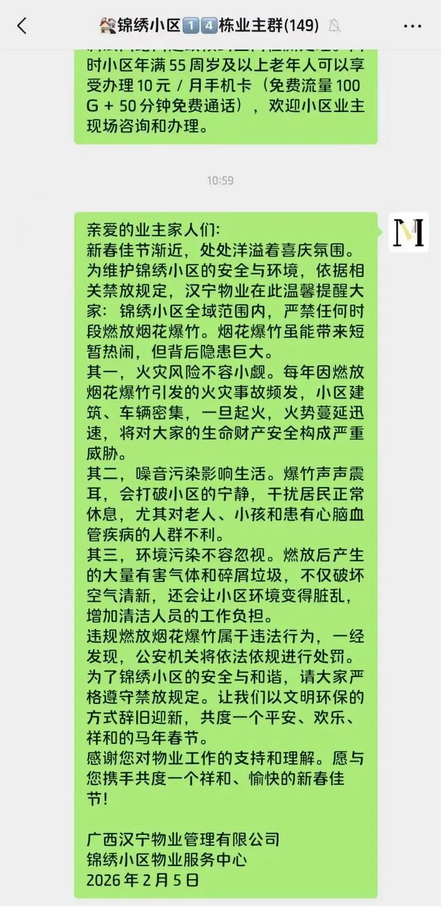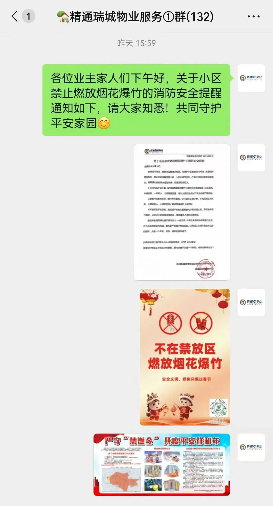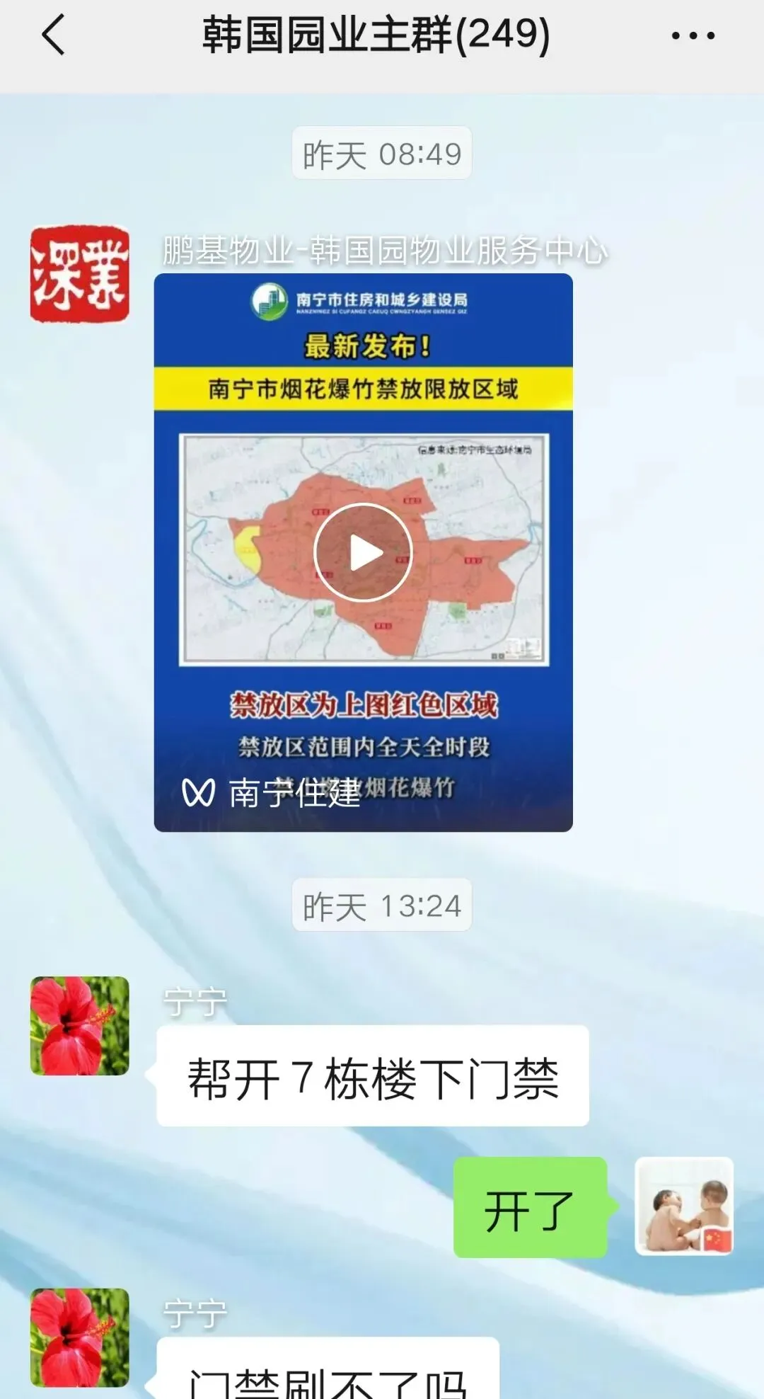 在业主群转发南宁市禁燃限放通知以及公安机关相关宣传视频。
