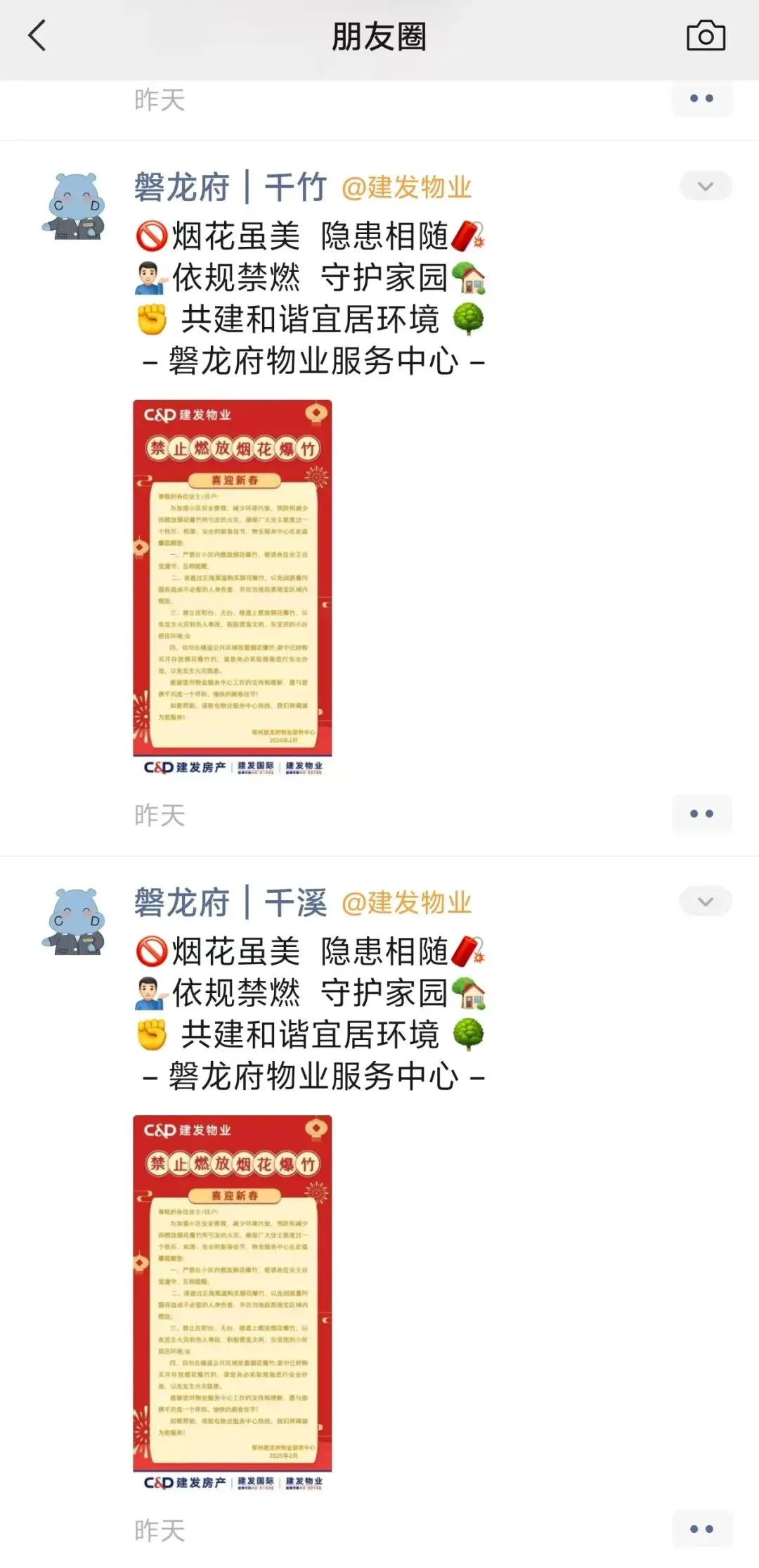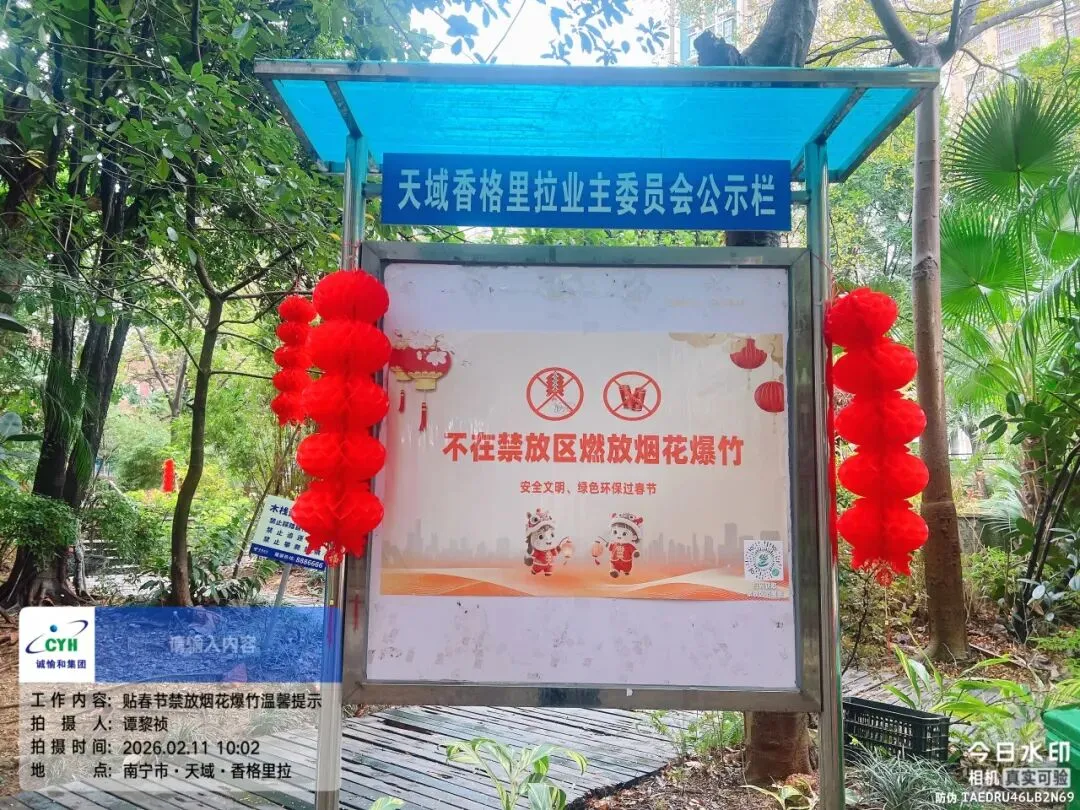 在天誉城、天誉花园全项目开展禁止燃放烟花爆竹宣传工作。通过线上业主群推送、线下张贴公告、入户提醒等方式,覆盖2大组团、近2万户业主。并在园区巡查过程中,劝导、引导居民文明过节。