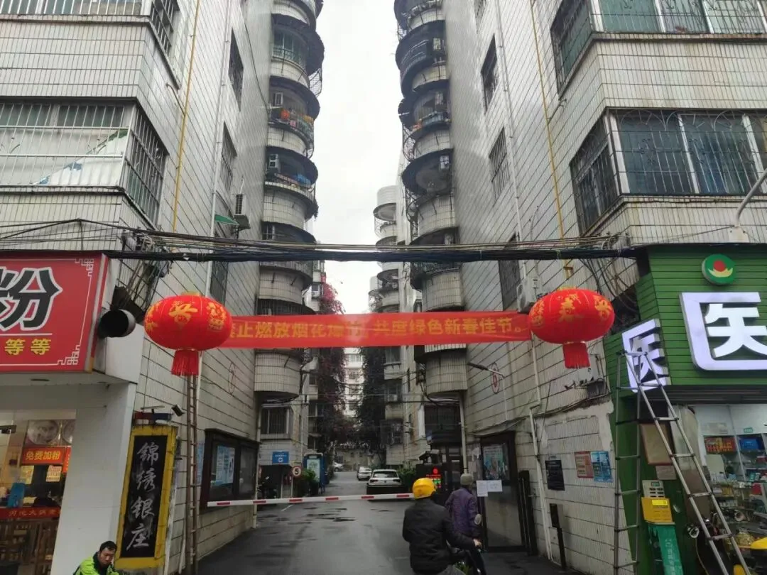 在布置小区新春装饰的同时,悬挂禁燃烟花爆竹宣传横幅、张贴相关温馨提醒。