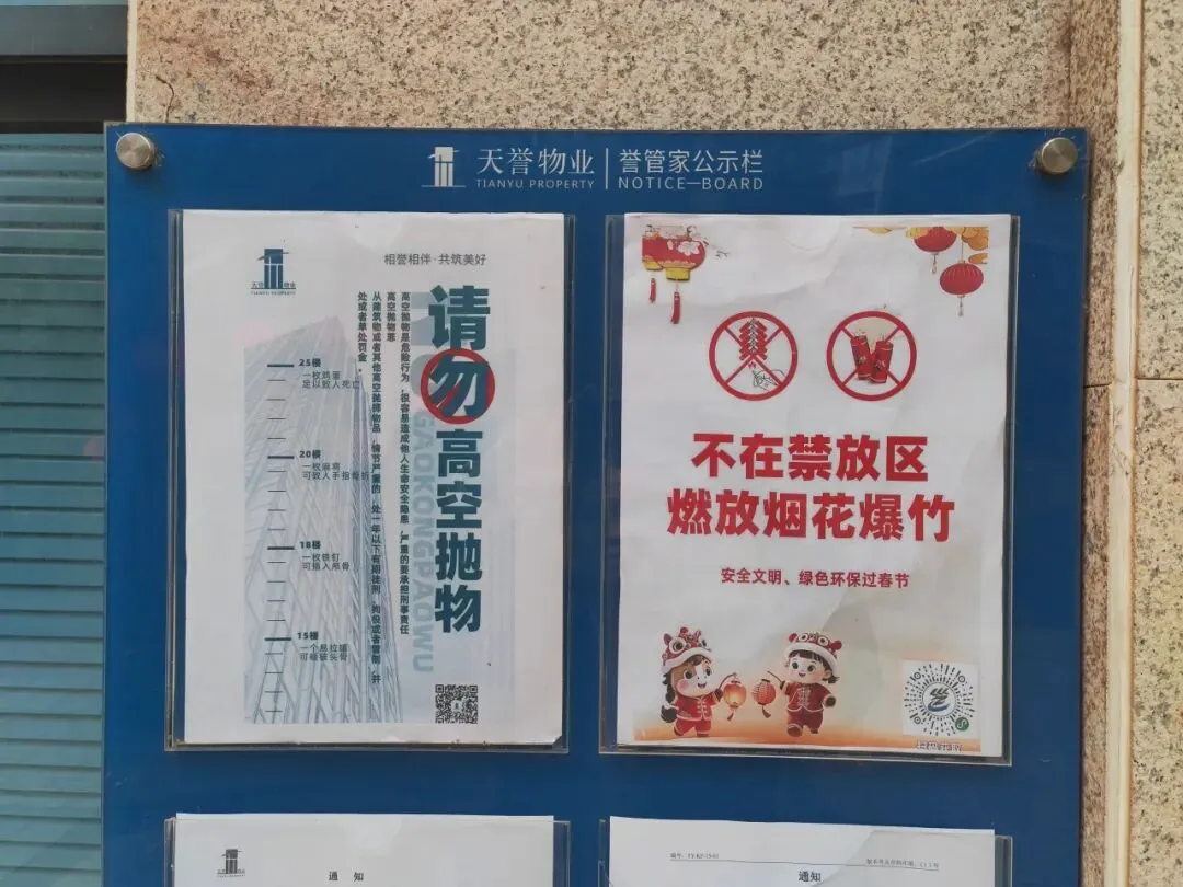 充分利用小区电梯公告栏、单元楼栋公告栏等渠道发布烟花爆竹禁放限放通知和提示。