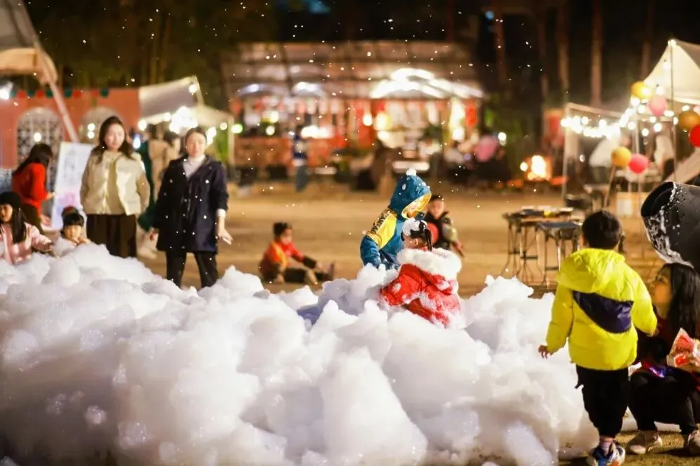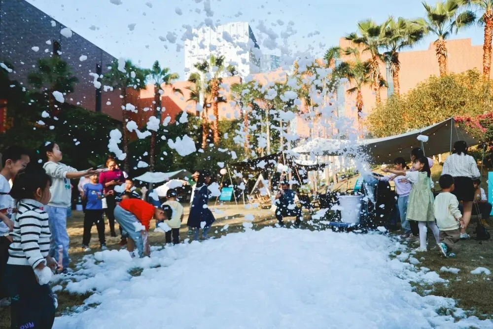 漫天飞舞的细腻泡泡如雪花飘落,这里是孩子们的快乐天堂。