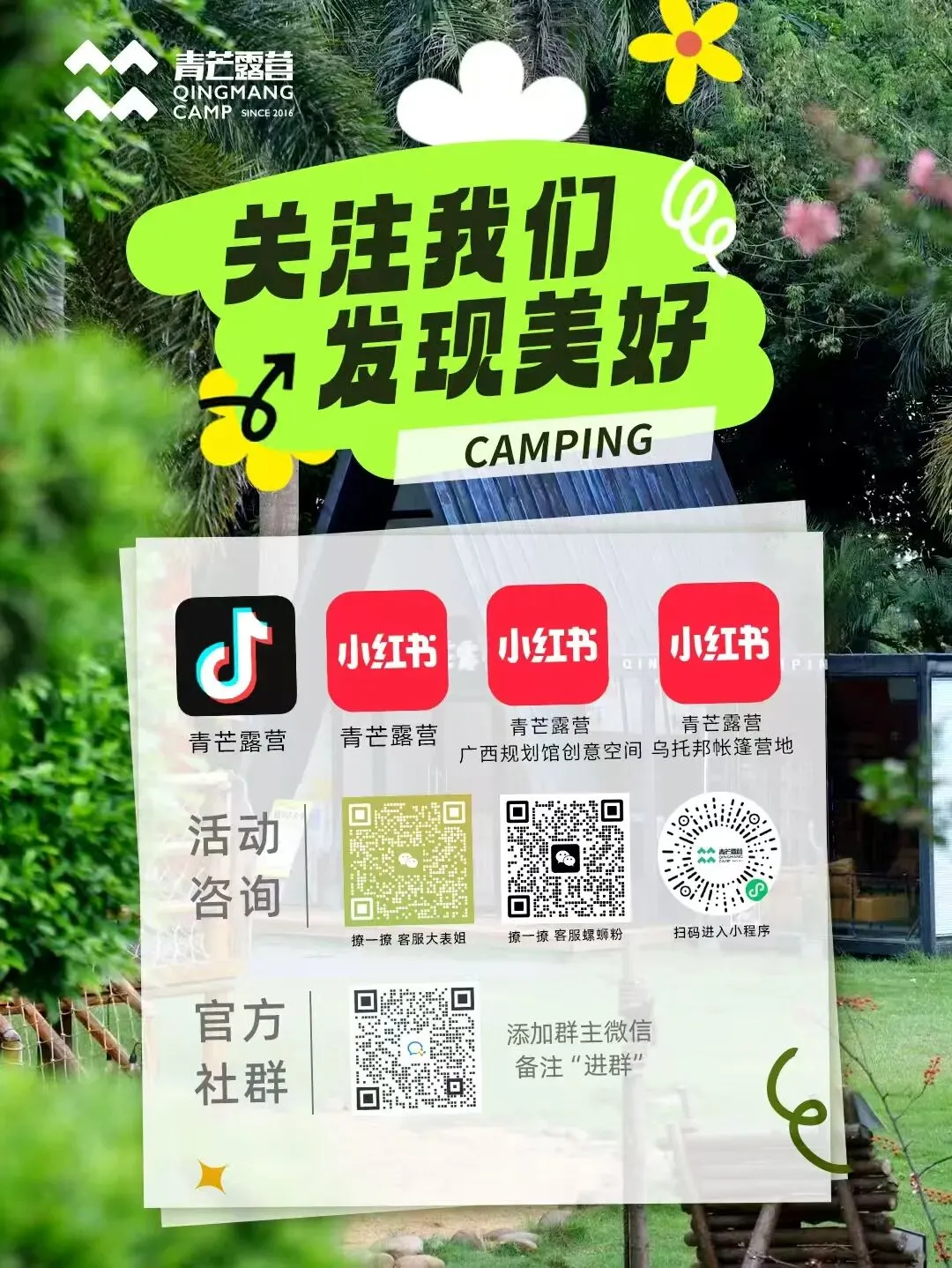 上午青秀山景区游玩→下午营地活动+烧烤下午茶→晚上赏灯逛集市