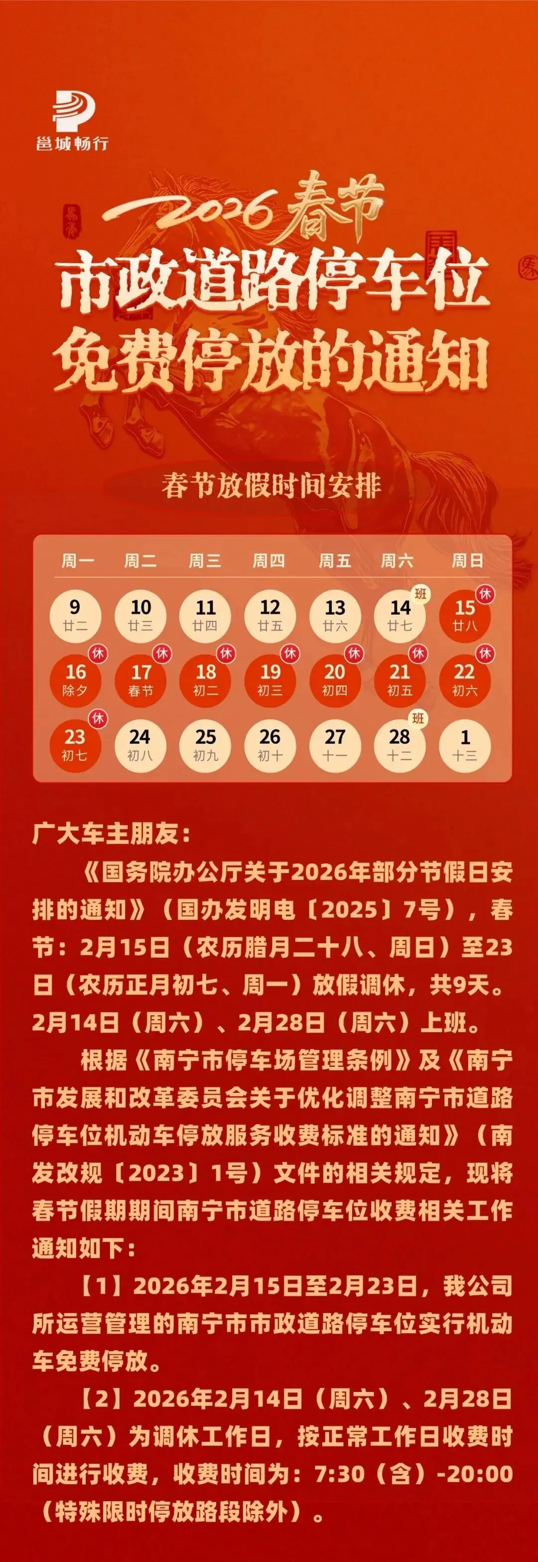 邕城畅行”微信公众号发布《2026年春节 | 南宁市政道路停车位免费停放的通知》,具体内容如下👇