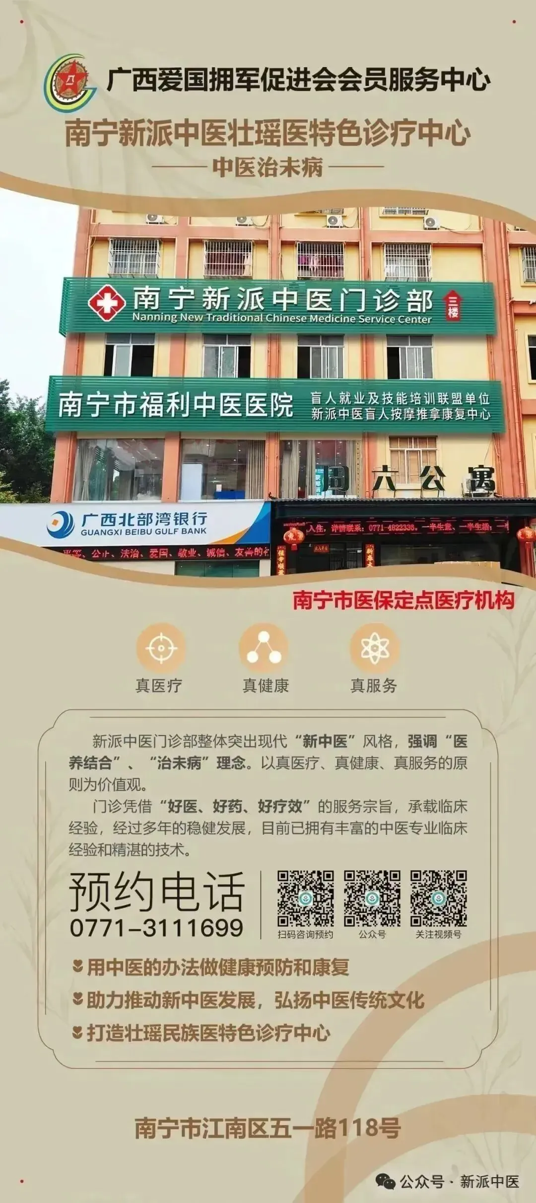 南宁新派中医始终秉持“新中医”发展理念,建设“新派中医”品牌,建立新中医业态支撑,创新中医药产业化发展新模式,承载AI赋能大健康新业态,将健康管理、康养服务、医疗保障延伸到社区,打造社区健康生活中心。以颠覆式创意,沉浸式体验,精准化消费,移动端传播的理念推进中医药创新发展,满足社区群众更便捷、更可及、更普惠的健康生活需求!