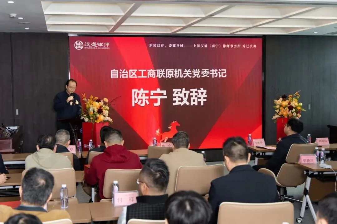 随后,自治区工商联原机关党委书记陈宁发表致辞。他充分肯定了汉盛南宁在服务民营经济、优化营商环境方面所做的努力,并寄语律所以此次乔迁为新起点,持续为民营经济发展提供坚实的法治护航,积极为广西民营企业“走出去”搭建法治桥梁,在助力区域法治建设进程中展现更大作为。