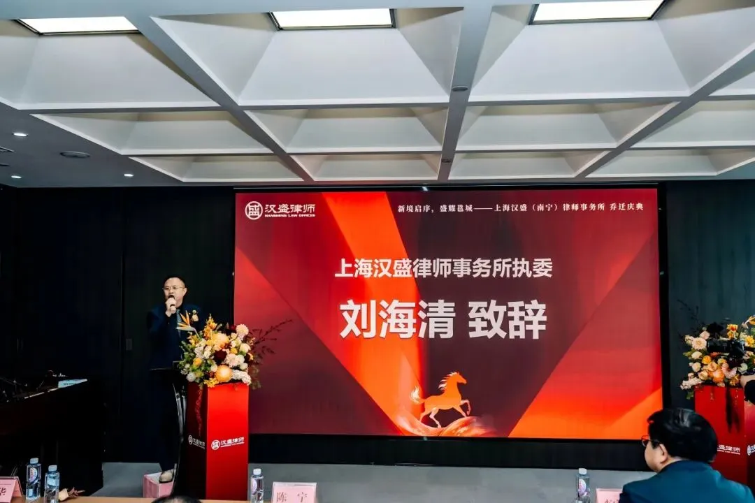 最后,上海汉盛律师事务所执委刘海清律师代表总所致辞。他分享了汉盛全国布局的战略思考,并对南宁分所的未来发展充满信心与期待,表示总所将持续给予全力支持,共同将汉盛品牌在八桂大地擦得更亮。