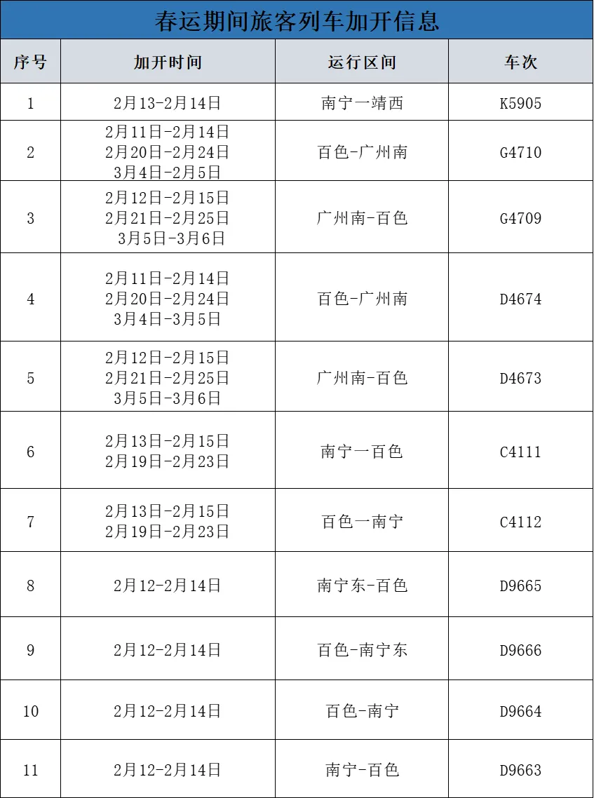 1.2月11日-14日、20日-24日,3月4日-5日加开G4710次:百色站22:47发车,途经南宁、梧州南等站,次日3:05抵达广州南站。