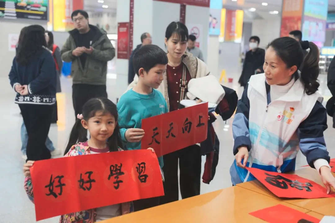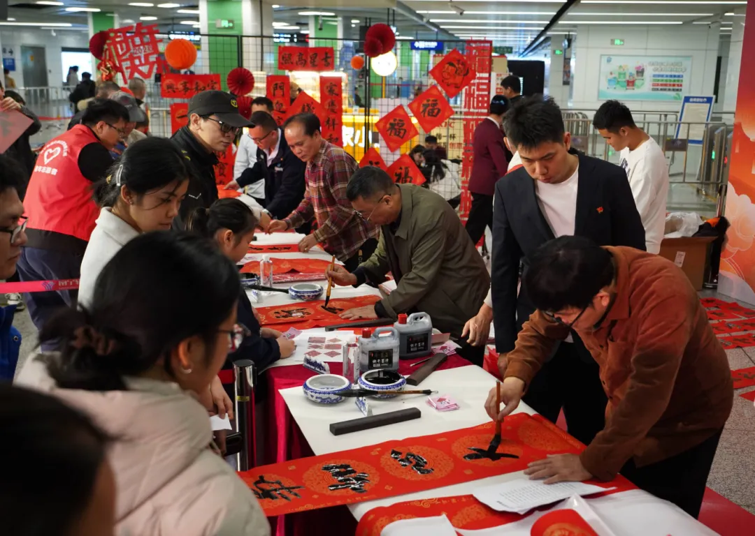 南宁轨道运营公司携手广西老年书画研究会,于2月2日至7日在广西大学站、火车东站、青秀山站等3个站点开展“福送万家·情满旅途”送春联系列公益活动,书法名家现场创作,累计为市民乘客送出手写春联800余副、福字约1000张,用墨香铺满春运归途。