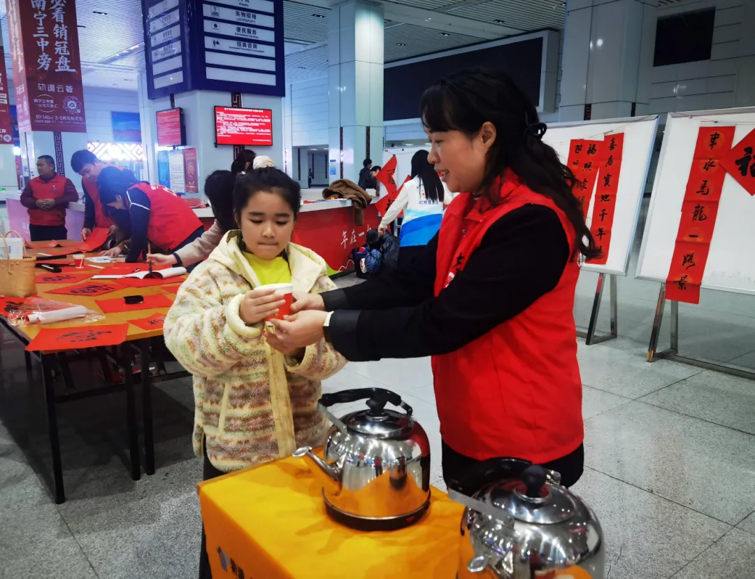 南宁轨道智慧生活集团在南宁东站南广场设立“叮咚暖心服务驿站”,为往来旅客、执勤人员送上红糖姜茶,提供路线指引、进站协助等服务;组建“叮咚服务队”,提供爱心专车接送、热姜茶配送、行李搬运、票务指引等志愿服务,助力春运旅途顺畅温馨。南宁轨道地产集团聚焦返乡群体,开展“返乡置业暖心行动”,设立便民咨询台提供政策解读、房源推荐、贷款指导等一站式服务,同步开展交通指引、行李协助等“助力春运”专项服务,切实解决返乡人员安居与出行需求。