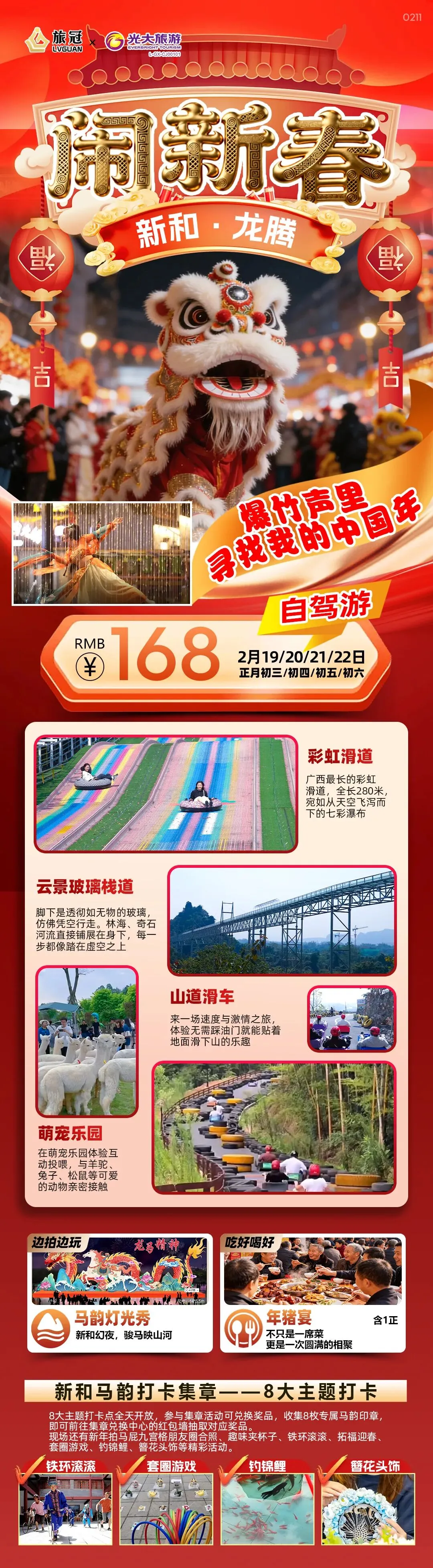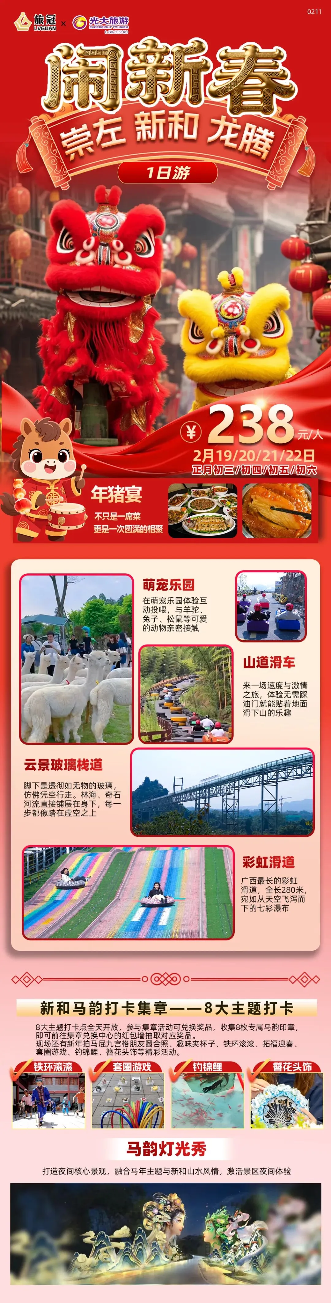 南宁出发2h!春节亲子专属短线游!去崇左夜新和吃年猪宴*萌宠乐园*彩虹滑道*山道滑车*玻璃栈道…还有集章抽奖体验!仅4期,早定早有位!