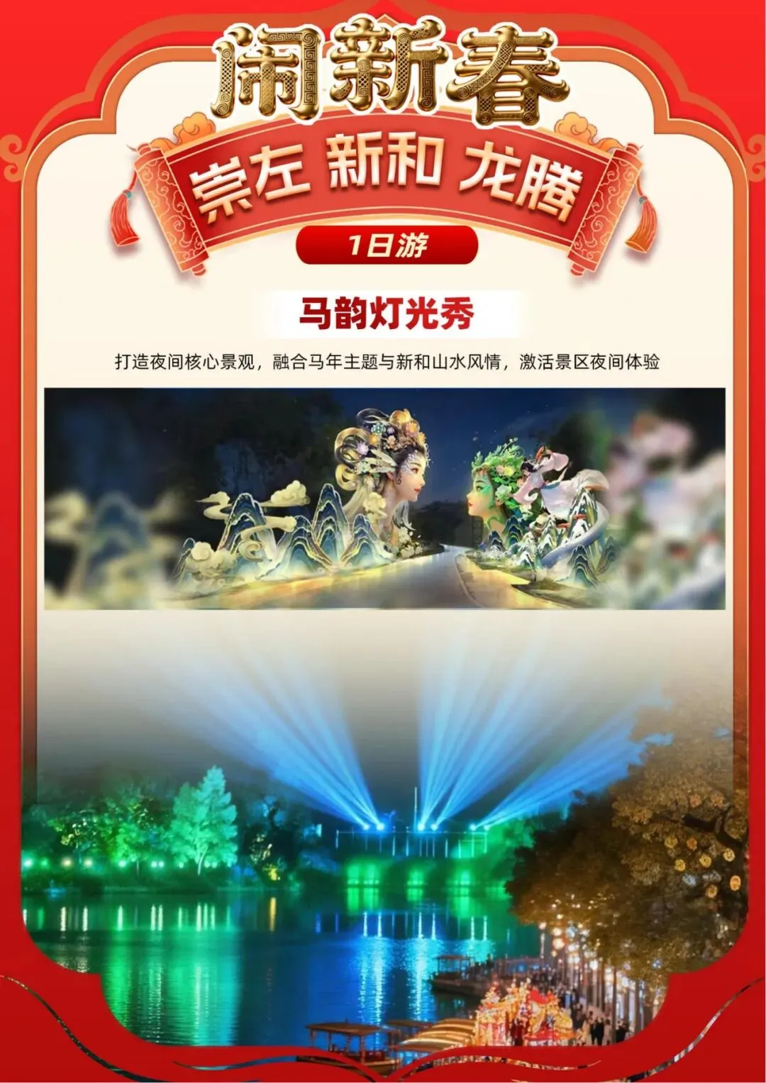 “夜新和”是崇左市江州区夜间经济文化旅游集聚区项目,依托黑水河自然风光与壮族文化,由商业街、音乐营地、码头、黑水和夜游构成,通过“光影+演艺+市集+夜游”模式构建沉浸式夜游体验,与度假区形成“日游+夜娱”的24小时全天候旅游模式, 为游客打造沉浸式、多元化文旅盛宴。