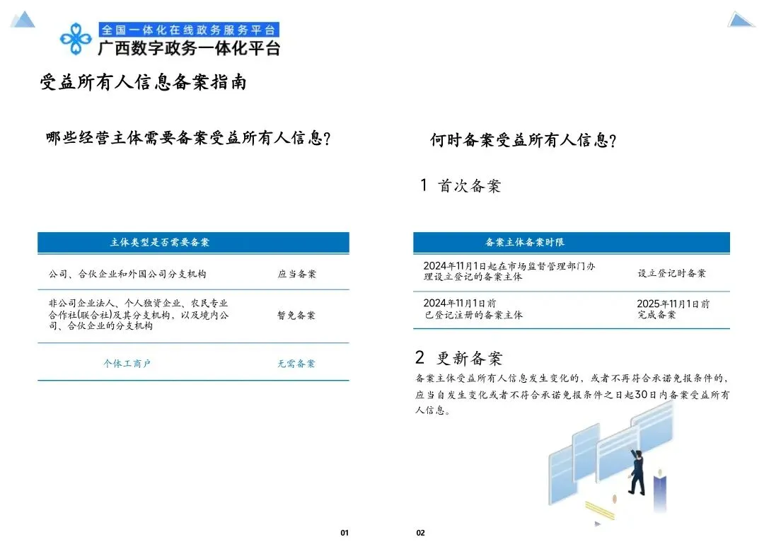 自2024年11月1日起,需要备案的主体在设立登记时,应当通过广西企业开办“一窗通”平台备案受益所有人信息;2024年11月1日之前已经登记注册的存量备案主体,应当于2025年11月1日前,按照该《办法》通过广西企业开办“一窗通”平台备案受益所有人信息。