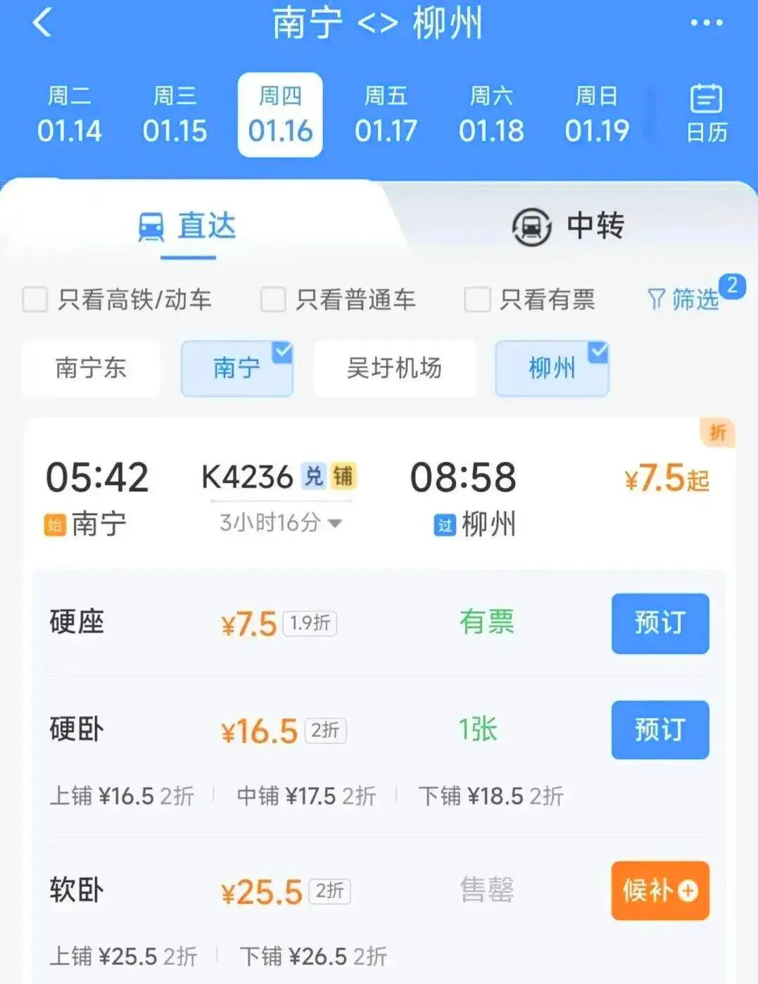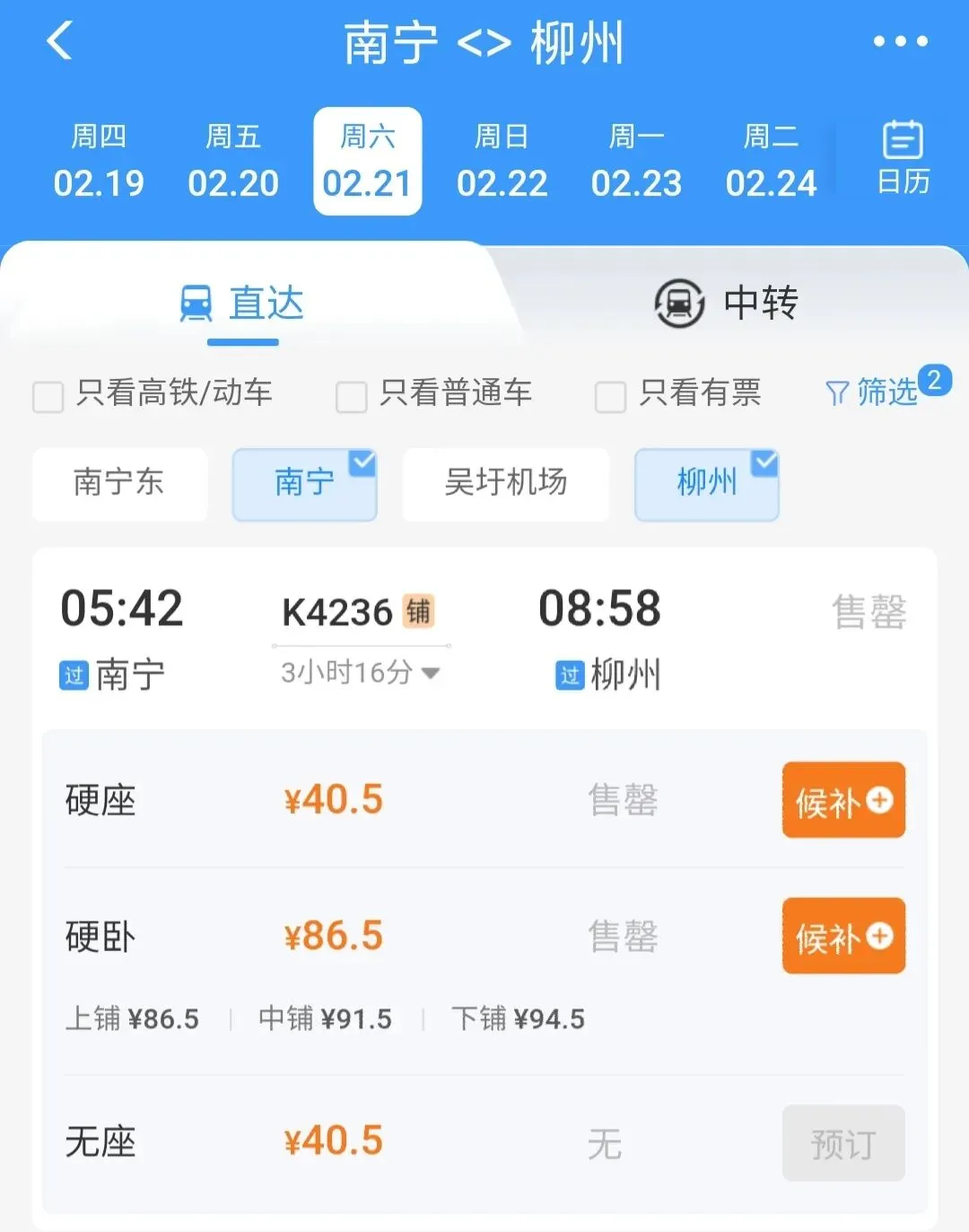 ▲2月21日K4236次列车40.5元起,已售罄