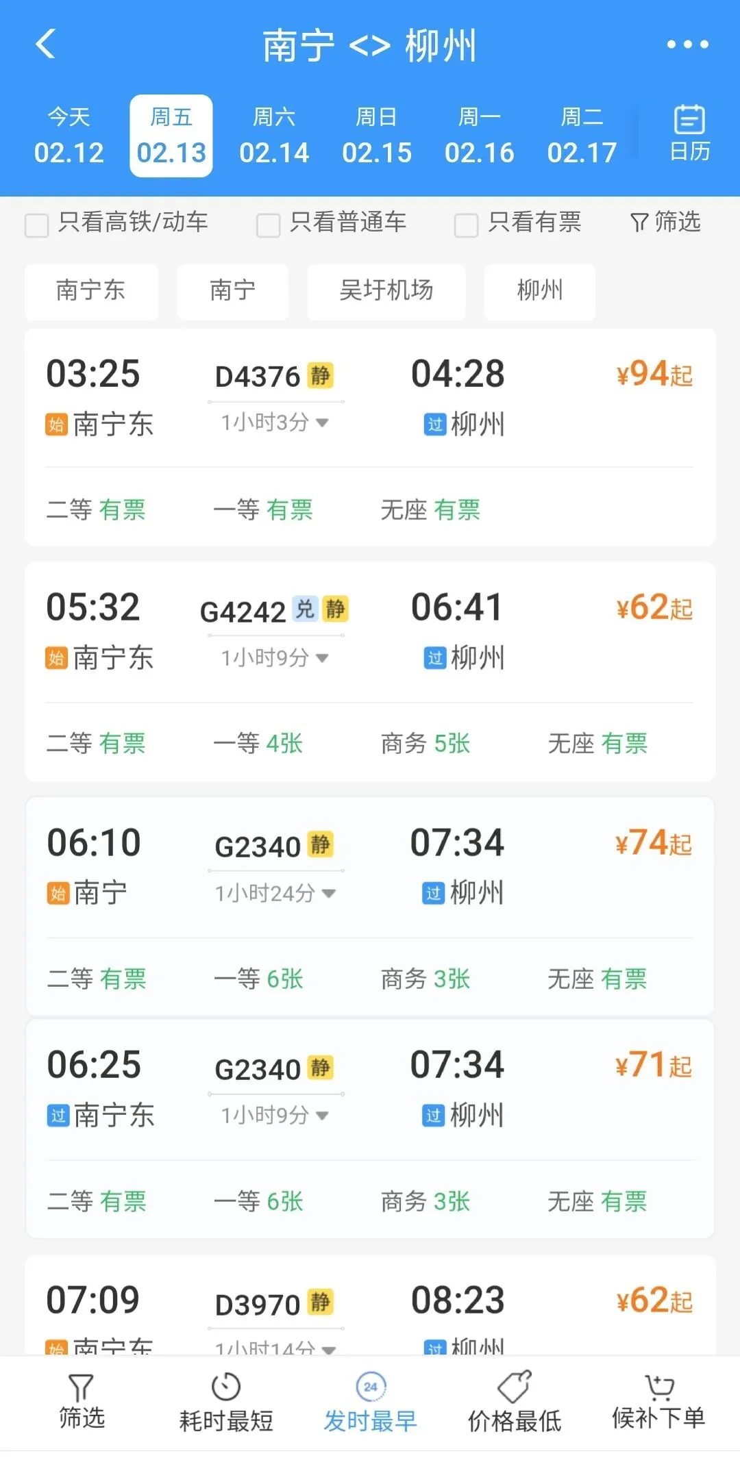 我看了下票价,南宁-柳州7.5元起,南宁-桂林北12.5元起,南宁-杭州42元起。