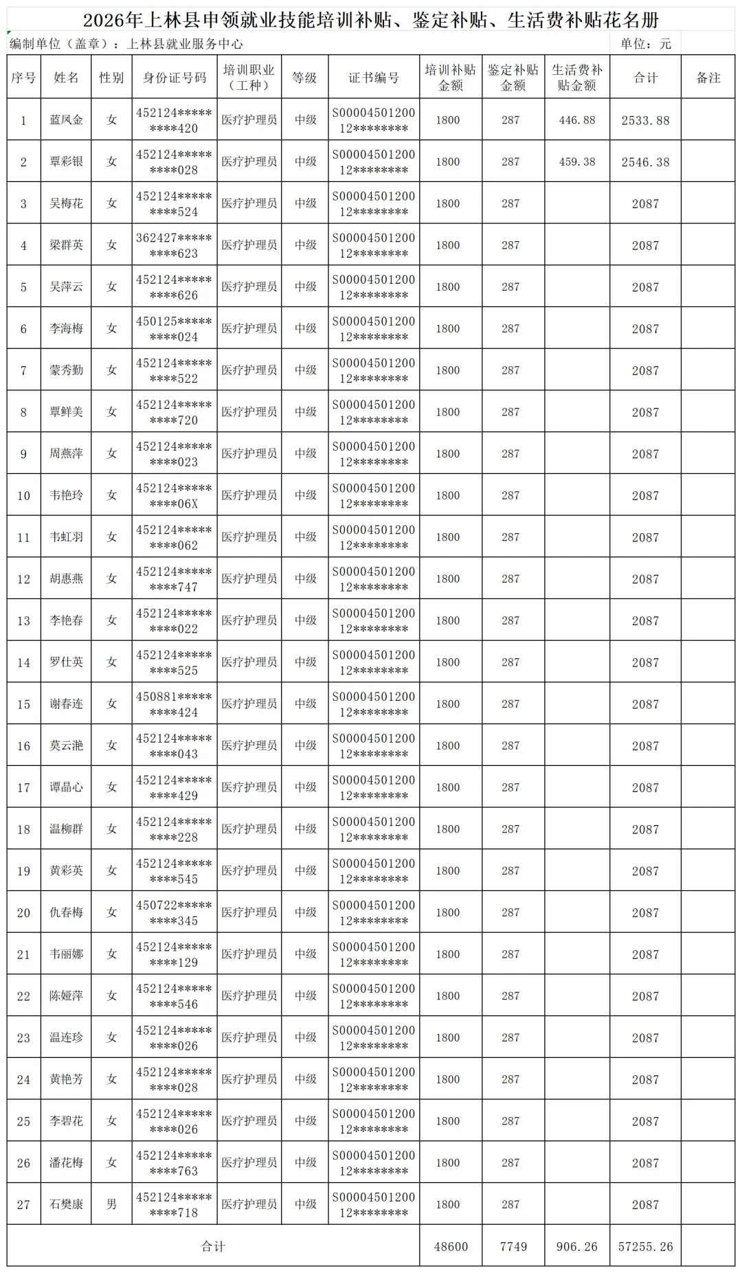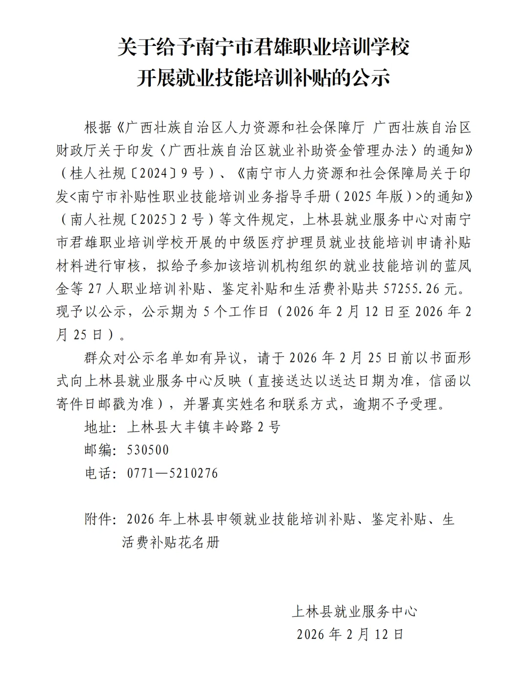 >【名单公示】关于给予南宁市君雄职业培训学校开展就业技能培训补贴的公示