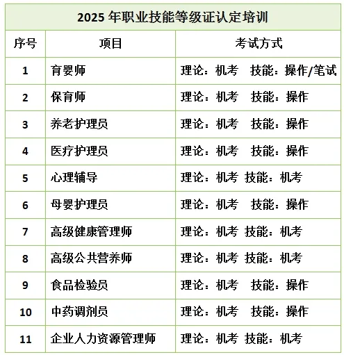 保育师、育婴员、母婴护理员(月嫂)、医疗护理员(护工)、心理辅导专项能力养老护理员、健康管理师、公共营养师、食品检验员、中药调剂员、企业人力资源管理师等职业技能等级证考证培训,符合条件拿证后可申请1000-2000元政府补贴!