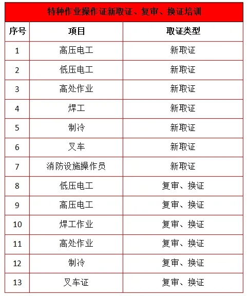 低压/高压电工证、焊工证、高处作业操作证、制冷与空调作业操作证、叉车证、消防设施操作员证等考证培训,全国通用,上岗必备!