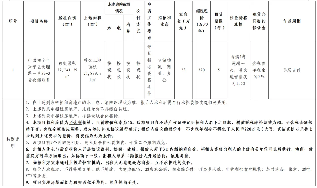 本项目位于广西壮族自治区南宁市兴宁区长堽路一里37-3号,移交建筑面积22,741.39平方米,移交土地面积21,839.51平方米。拟租赁业态为仓储物流、商业、办公。