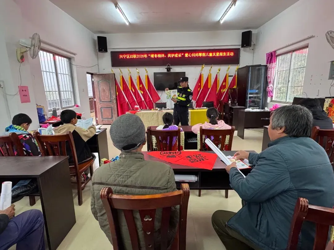 2月10日,兴宁区妇联、昆仑镇妇联、昆仑镇派出所联合到兴宁区富兴村开展“暖冬相伴 共护成长”2026年寒假儿童关爱服务暨“爱心妈妈”关爱行动。活动现场,昆仑派出所警官组织开展禁毒、交通安全知识和预防未成年人犯罪等宣传教育,提高孩子们遇到不法侵害时保护自己、帮助他人的能力。