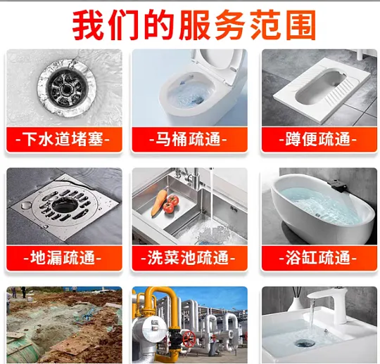 疏通服务:家庭、酒店、饭店、店铺下水道疏通;马桶堵塞处理与异物捞取;面盆、菜池、蹲坑、地漏专业疏通与维修