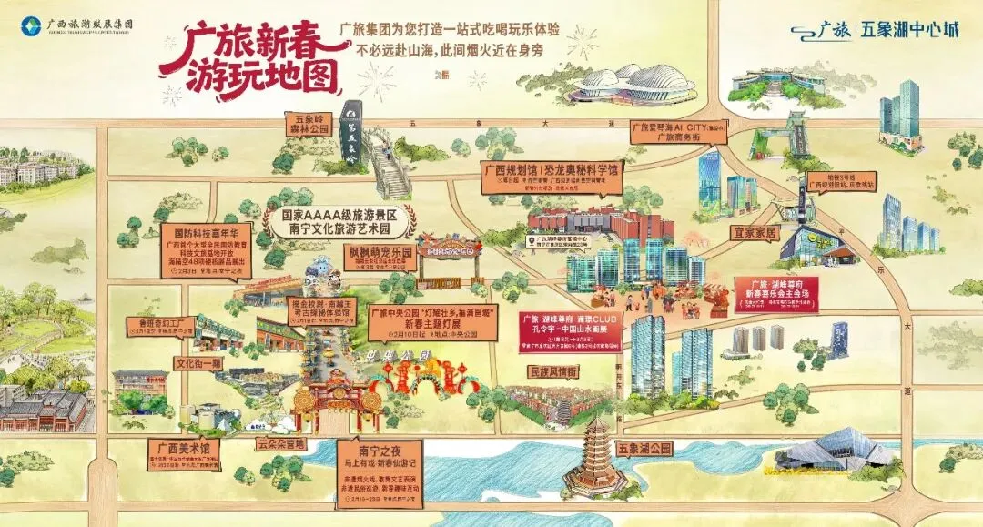 2月10日晚,广旅中央公园新春嘉年华盛大启幕,标志着五象湖片区——南宁文化旅游艺术园再次升级,一系列新春文旅活动也正式拉开帷幕。本次嘉年华活动将以丰富多元的沉浸式体验与年味十足的主题内容,为市民游客献上一场有温度、有年味的新春文旅盛宴。 广旅中央公园新春嘉年华,是广旅置业集团充分发挥城建运营板块优势,精心打造的又一场沉浸式文旅盛宴。项目依托中央公园生态本底,以“灯”为媒、以“福”为魂,有机融合广西多民族文化、传统年俗韵味与前沿光影科技,致力于打造一个“文化有温度、童趣有快乐、科技有新意、年味有归属”的沉浸式灯会主题乐园。未来,广旅置业集团将持续发挥广旅集团全产业链资源整合与运营优势,加快推进“南宁之夜中央公园”系列后续项目建设与运营提升,力争将该项目打造成为群众喜爱、体验丰富、在全区具有显著影响力的文旅融合示范项目和城市微度假目的地。 本次嘉年华核心的花灯展,由四川自贡花灯非遗团队匠心打磨,共推出“天马降福”“邕城春禧”“壮乡儿女”等近40组造型鲜活、寓意吉祥的主题灯组。9.5万平方米园区内光影流转,山顶30米巨型灯组气势恢宏,与湖面灯影交相辉映,一步一景,营造出如梦如幻又喜庆祥和的视觉体验。 国家AAAA级旅游景区南宁文化旅游艺术园是广西旅游发展集团深挖本土民俗、精心打造的综合型文旅度假区,也是广西首个融合夜游、文化艺术、城市度假与休闲游乐的特色景区,园区包含了广旅·南宁之夜、广旅欢乐世界萌宠乐园、广西美术馆、广旅·文化街一期等多个项目板块。春节期间,园区内准备了一系列丰富多彩的新春文旅活动,多点联动、好戏连台,让新春文旅氛围更浓、内涵更足。 图为新春嘉年华灯展。 广旅·南宁之夜也推出“马上有戏·新春仙游记”系列活动。除夕守岁、药发木偶戏、天女散花、醒狮送福等特色展演轮番上演,还有NPC互动、拓福迎春等民俗体验项目,让游客在欢声笑语中感受传统民俗魅力。 广旅欢乐世界萌宠乐园里温顺的羊驼与憨态可掬的矮马将依次亮相,与游客进行亲密互动并拜年贺岁。 国防教育科技展也将精彩不断,国防知识大冲关、轻武器拆装大擂台等一系列超有趣的亲子互动活动即将欢乐上演,将为游客带来一场兼具知识性与趣味性的新春体验。 闹中取静,移步至广西美术馆,这里正在上演一场穿越千年的视觉史诗,“盛世修典——‘中国历代绘画大系’成果展·广西特展”正在热展中,特展汇聚了1600余件从先秦到明清的国宝级高清绘画打样稿,在“薪火相传”、“千古丹青”等四大板块中一站式饱览《千里江山图》、《清明上河图》等传世名作的震撼细节,感受中华千年文脉与广西灵秀山水的交融辉映。这里不仅是拍照圣地,更是春节里滋养心灵的绝佳去处。图为“盛世修典——‘中国历代绘画大系’成果展·广西特展”。