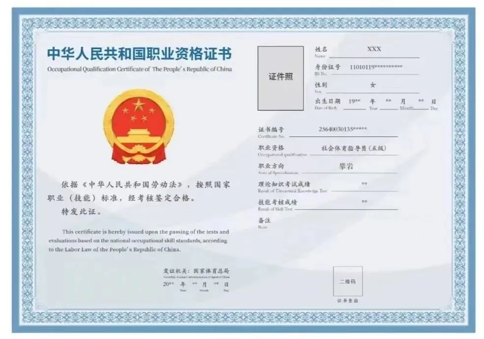 经考核通过将获得国家体育总局、人力资源和社会保障部,颁发的准入类职业资格证书“国家职业资格初级攀岩社会体育指导员证书”。