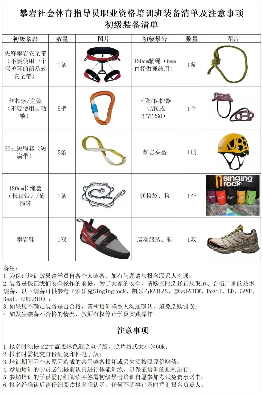 4、请培训学员自备个人技术装备,其攀岩装备须符合GB标准或UIAA、CE标准。