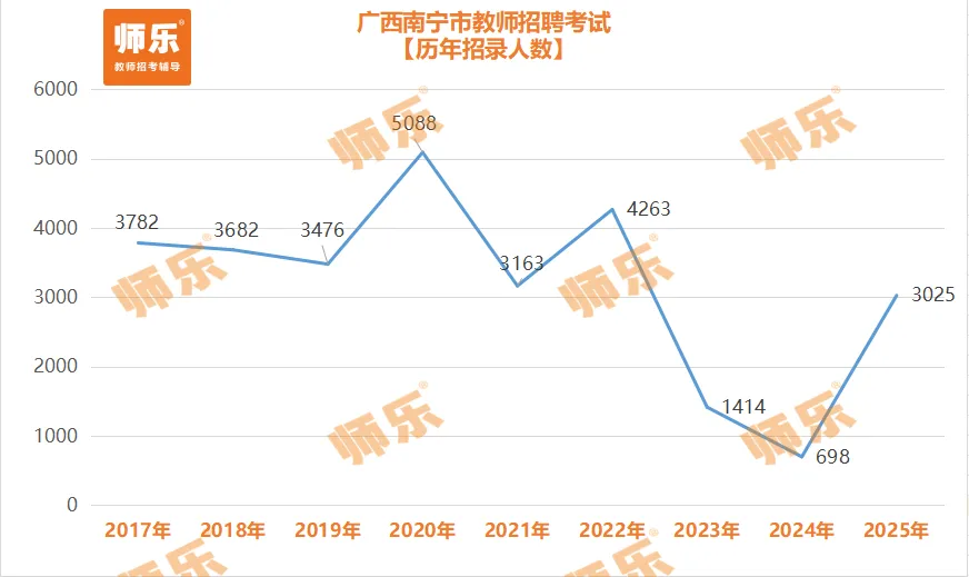 南宁市教师招聘从2025年起招聘形式回归全市统招后,招录人数迎来近3年小高潮,共招聘3025人。2023、2024年招录人数较少是因为部分区县如:青秀区、市直、兴宁区、良庆区等均进行了自主招聘,所以统招招录人数较少。