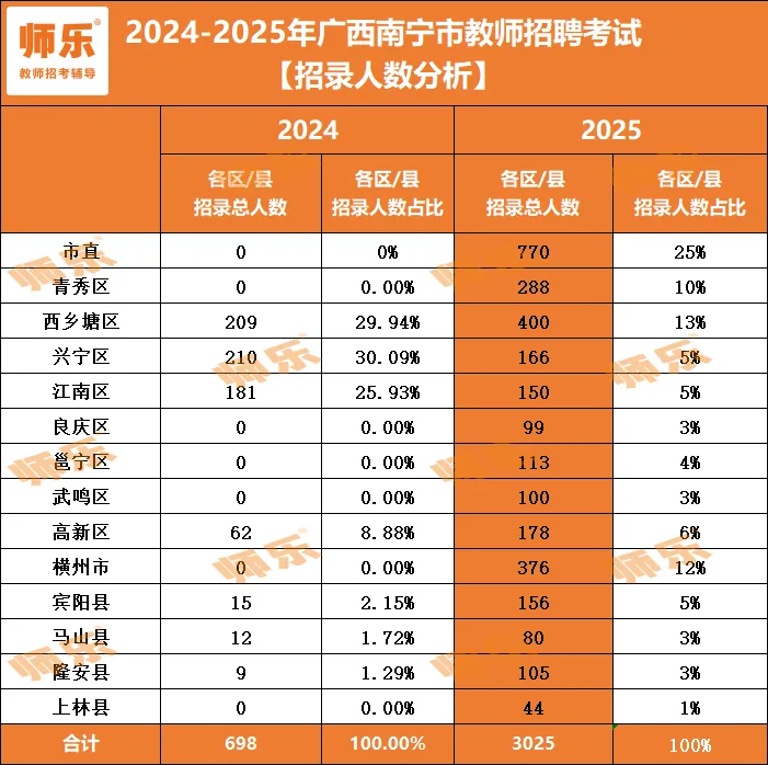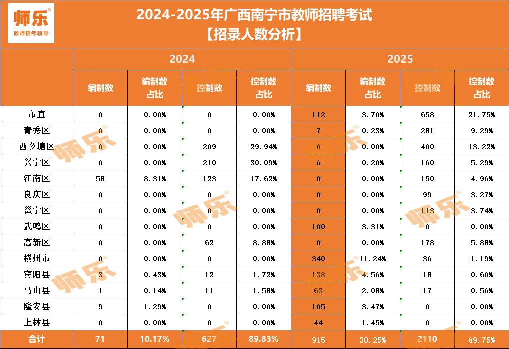 2025年南宁市教师招聘编制数占比30.25%。其中武鸣区、隆安县、上林县全部使用实名编制,横州市使用实名编制招聘340人,占比11.24%。