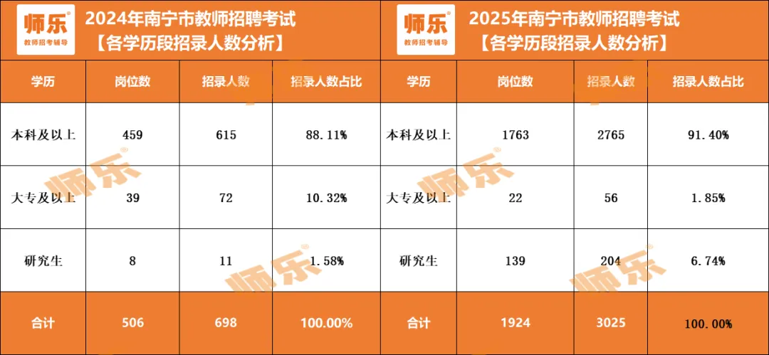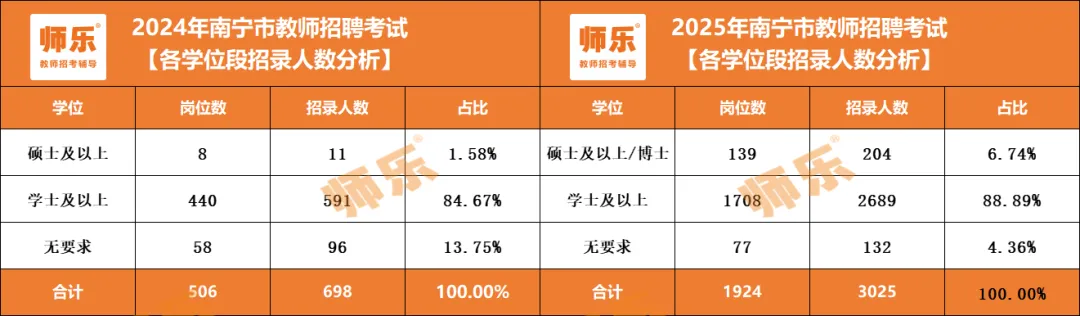25年在广西教招报名条件都提高的情况下,南宁市要求学士及以上的招录人数2689人,占比88.89%。无要求的招录人数:132人,占比4.36%。无学位要求岗相较于2024年,从招录占比上看,下降9.39%,而研究生学位占比上涨5.16%。南宁市教师招聘对学历、学位的要求也有很明显的提高。