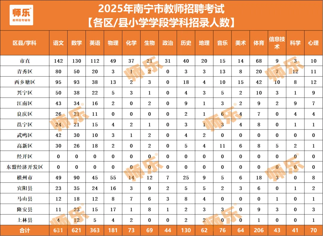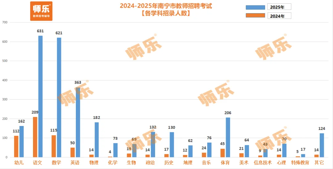 2025年招录人数最多的学科是语文、数学、英语三个学科,语文学科招录人数631人,数学学科招录人数621人。英语招录人数363人。值得一提的是,2025年南宁全市体育岗招206人,相较于往年大幅扩招。