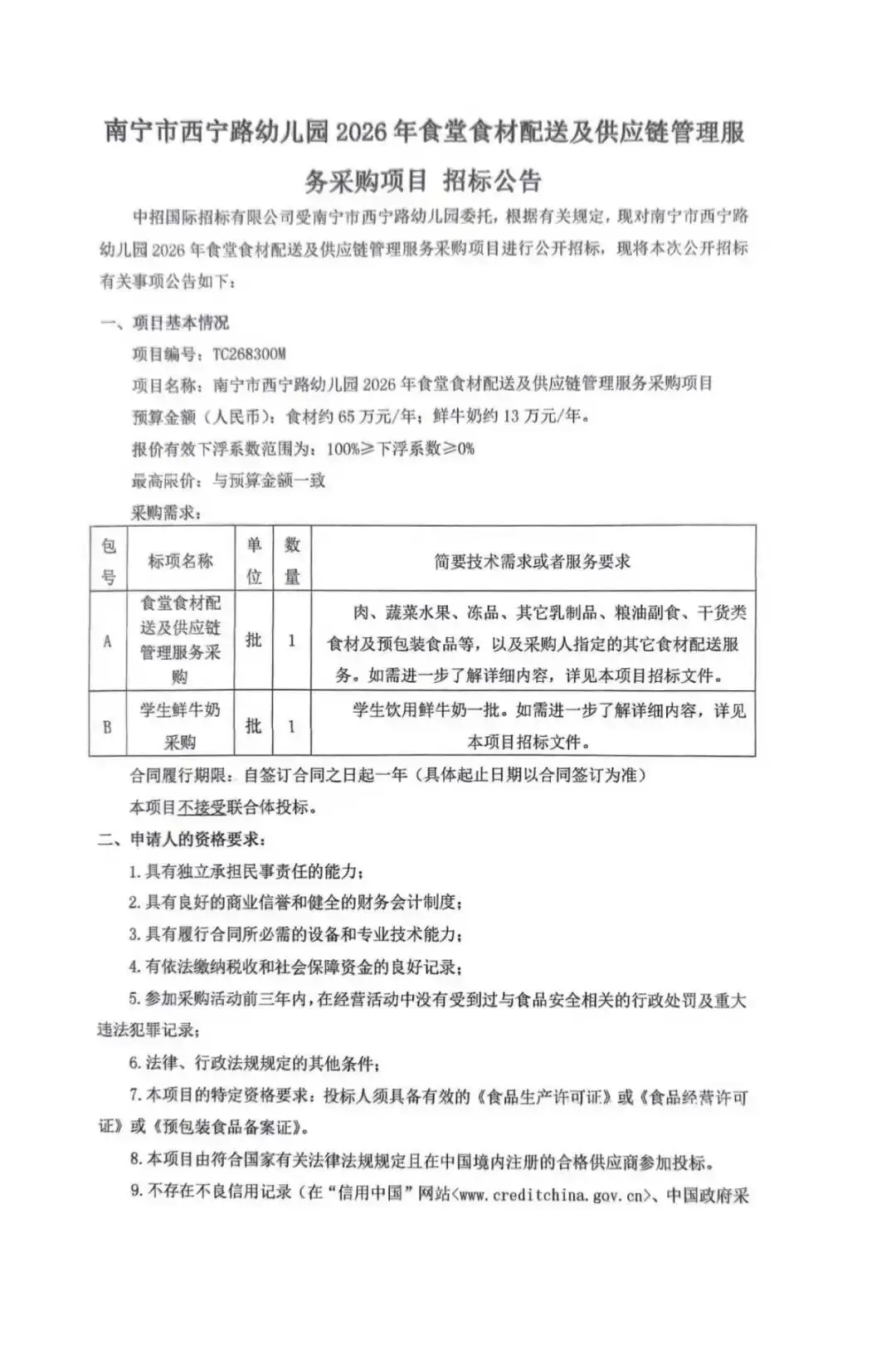 南宁市西宁路幼儿园2026年食堂食材配送及供应链管理服务采购项目招标公告