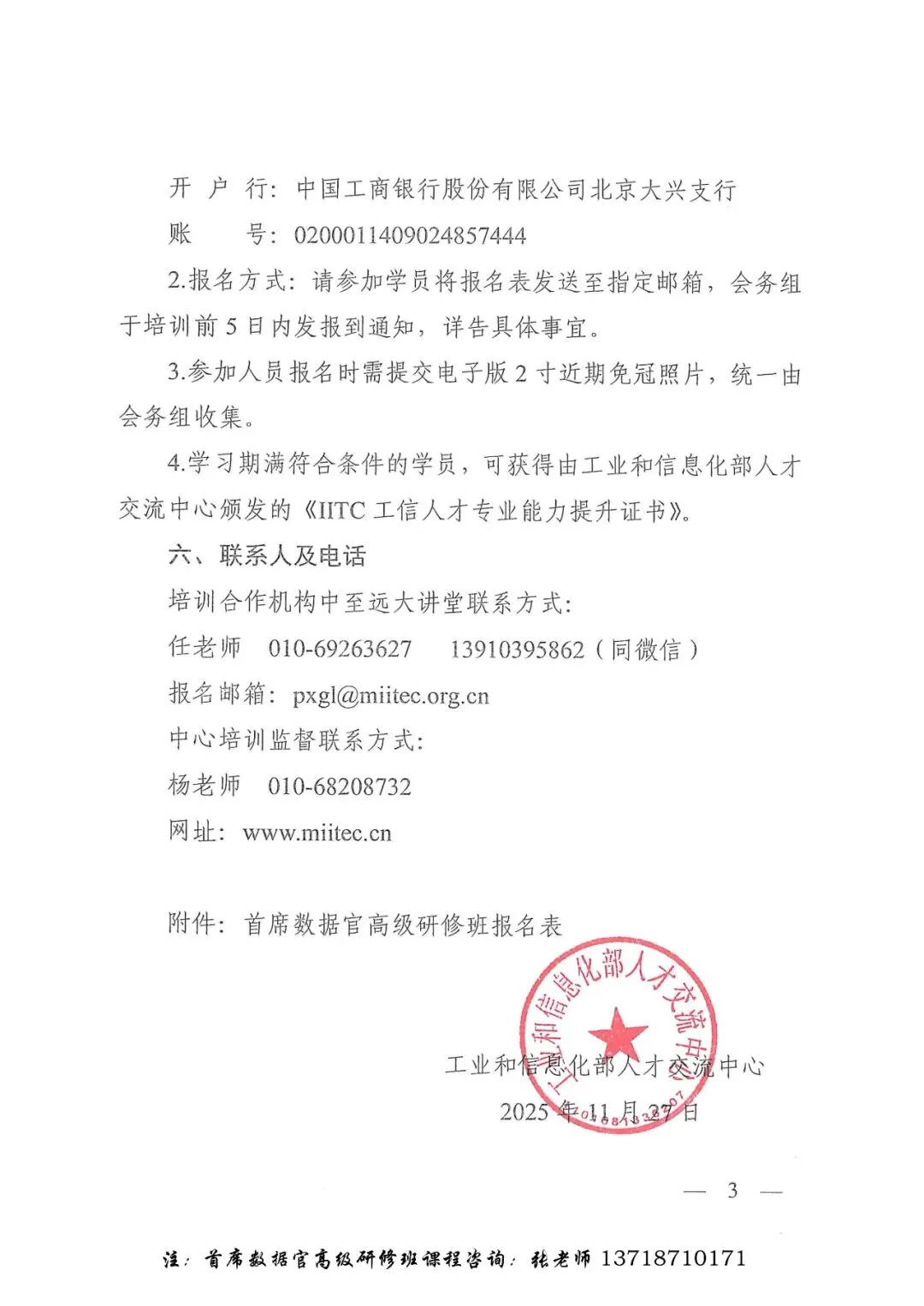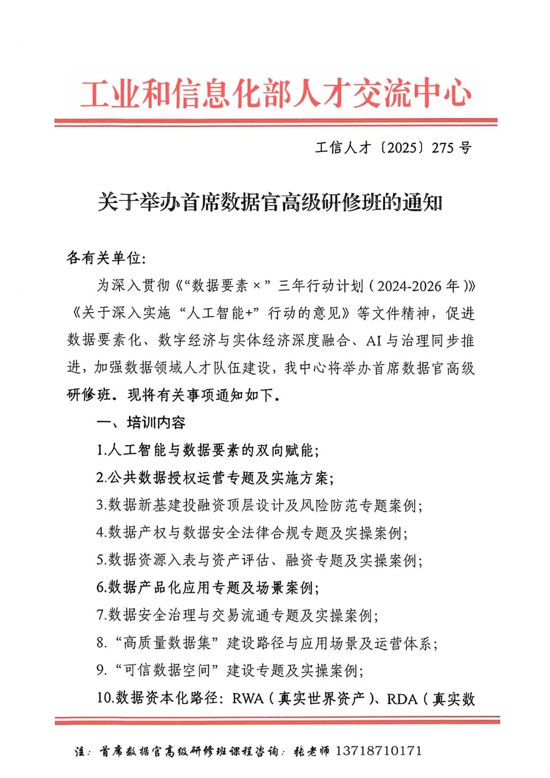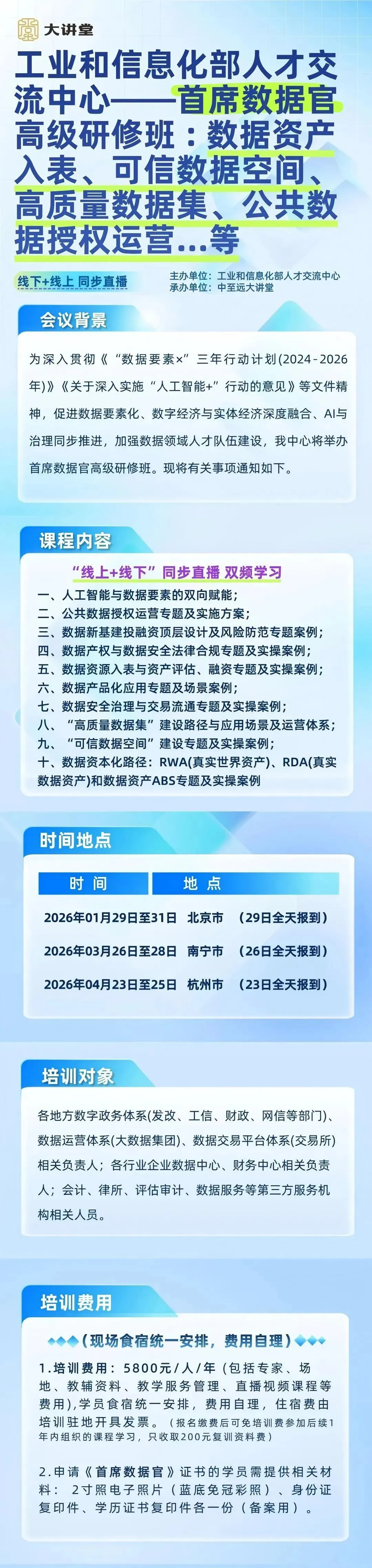 在工业和信息化部人才交流中心的指导和监督下,中至远大讲堂组织开展首席数据官高级研修班,是培养数字时代领军人才的重要战略行动。我们聚焦数据要素价值释放,致力于赋能企业数字化转型,系统化培育兼具战略思维、治理能力和创新意识的数据领军人才,为企业高质量发展注入新动能,为数字中国建设夯实人才基础。
