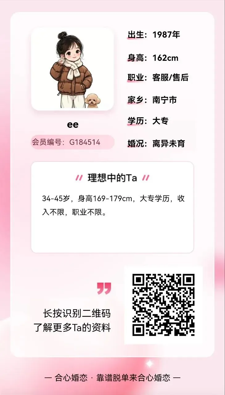 >南宁相亲,女生,1987年,身高162,南宁客服/售后,大专学历,离异未育
