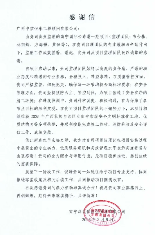 近日,由中信恒泰负责监理的南宁国际公路港一期项目顺利完成竣工验收、消防验收及安全评估工作,并斩获2025年广西壮族自治区及南宁市级安全文明标准化工地、优质结构奖等多项荣誉,中信恒泰凭借专业的监理服务,获南宁深邕供应链管理有限公司致信感谢。